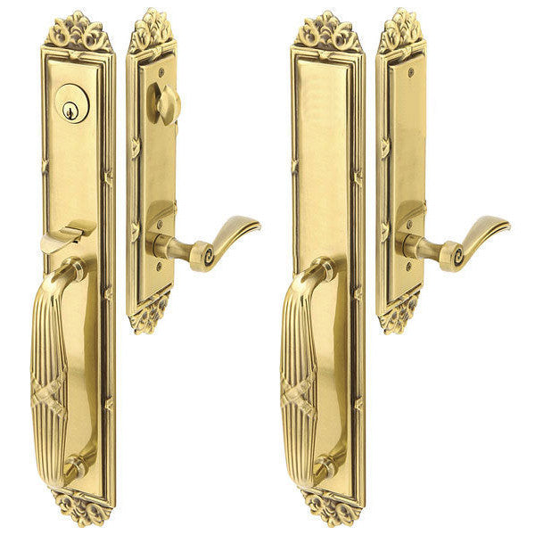 Solid Brass Imperial Style Entryway Set - this entryway set measures 3 inch wide by 20 inch tall. Various styles of knobs available at no additional charge. Entryway set deadbolt to knob center-to-center distance is 5 1/2 inches. Entryway backset comes as 2 3/8 inch standard and a 2 3/4 inch backset is available if required. The overall grip thickness is 1 5/16 inch. The clearance between the door and grip is 1 9/16 inches. The plates have a thickness of 1/2 inch. This is a complete set and it comes with tubular latch mechanisms, strike plates, complete knob sets, internal mechanisms, deadbolts and all mounting hardware.