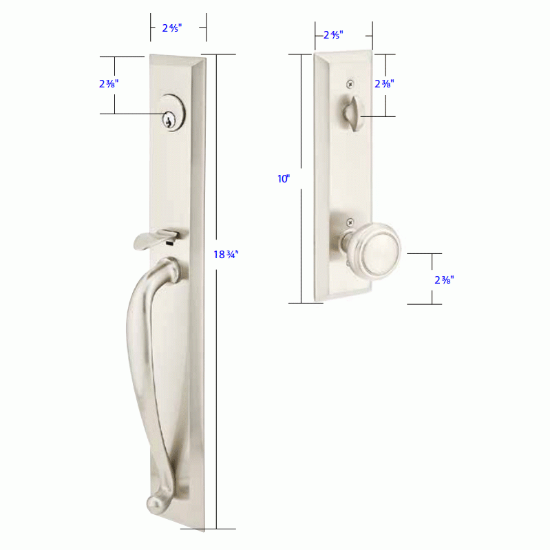 Solid Brass Jefferson Style Entryway Set (Brushed Nickel Finish) - this entryway set measures 2 4/5 inch wide by 18 3/4 inch tall. Various styles of knobs available at no additional charge. Entryway set deadbolt to knob center-to-center distance is 5 1/2 inches. Entryway backset comes as 2 3/8 inch standard and a 2 3/4 inch backset is available if required. The overall grip thickness is 1 1/4 inch. The clearance between the door and grip is 2 inches. The plates have a thickness of 1/2 inch. This is a complete set and it comes with tubular latch mechanisms, strike plates, complete knob sets, internal mechanisms, deadbolts and all mounting hardware.