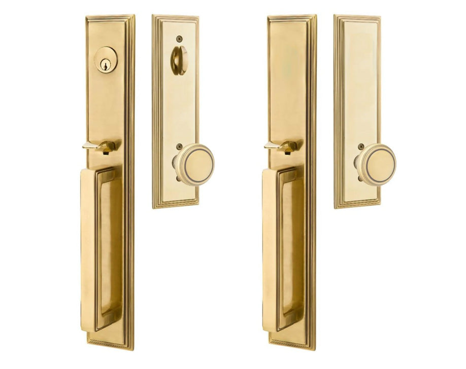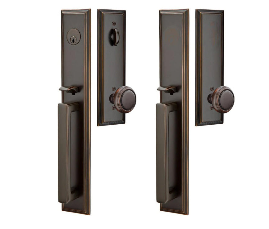 Solid Brass Melrose Style Entryway Set (Brushed Nickel Finish) - this entryway set measures 3 inch wide by 18 1/2 inch tall. Various styles of knobs available at no additional charge. Entryway set deadbolt to knob center-to-center distance is 5 1/2 inches. Entryway backset comes as 2 3/8 inch standard and a 2 3/4 inch backset is available if required. The overall grip thickness is 2 5/8 inch. The clearance between the door and grip is 1 3/8 inches. The plates have a thickness of 1/2 inch. This is a complete set and it comes with tubular latch mechanisms, strike plates, complete knob sets, internal mechanisms, deadbolts and all mounting hardware.