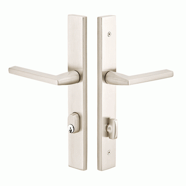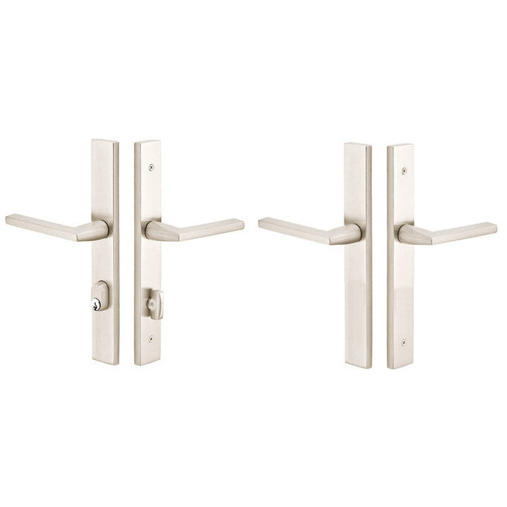 Solid Brass Modern Rectangular Style Stretto Passage Entryway Set (Brushed Nickel Finish) - The entryway set shown here features a carefully crafted rectangular style shape. This entryway set comes with the interior and exterior plates, deadbolt and thumb turn, tubular latch assembly and the door mounting hardware. Measures 1 1/2 inches wide by 11 inches tall. Includes a 3 3/8 inch center to center hole spacing for thumbturn privacy. Also includes narrow 1 1/4 inch door preps. A 28 degree latch is available for 2 3/8 inch backsets. Handing is required for Leverset. Sold as a complete set with the Helios lever shown. Includes latch and strike plate.