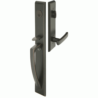 Solid Brass Orion Style Entryway Set (Oil Rubbed Bronze Finish) - this entryway set measures 2 1/2 inch wide by 18 1/2 inch tall. Various styles of knobs available at no additional charge. Entryway set deadbolt to knob center-to-center distance is 5 1/2 inches. Entryway backset comes as 2 3/8 inch standard and a 2 3/4 inch backset is available if required. The overall grip thickness is 1 inch. The clearance between the door and grip is 1- 1 3/4 inches. The plates have a thickness of 1/2 inch. This is a complete set and it comes with tubular latch mechanisms, strike plates, complete knob sets, internal mechanisms, deadbolts and all mounting hardware.