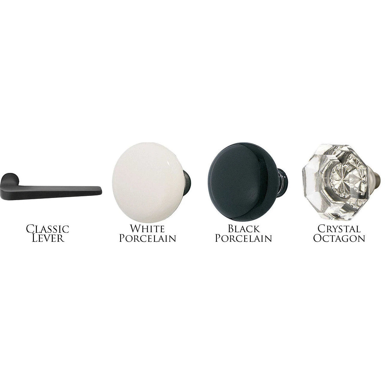Solid Brass Rectangular Full Length Style Entryway Set (Medium Bronze Finish) - this entryway set measures 2 1/4 inch wide by 19 inch tall. Various styles of knobs available at no additional charge. Entryway set deadbolt to knob center-to-center distance is 5 1/2 inches. Standard door thickness is 1 3/4 inch, specify if thicker. Locks for in-swing doors are standard, for out-swing doors please specify. Entryway backset comes as 2 3/8 inch standard and a 2 3/4 inch backset is available if required. The overall grip thickness is 1 11/16 inch. The clearance between the door and grip is 1 7/8 inches. The plates have a thickness of 1/2 inch. This is a complete set and it comes with tubular latch mechanisms, strike plates, complete knob sets, internal mechanisms, deadbolts and all mounting hardware.