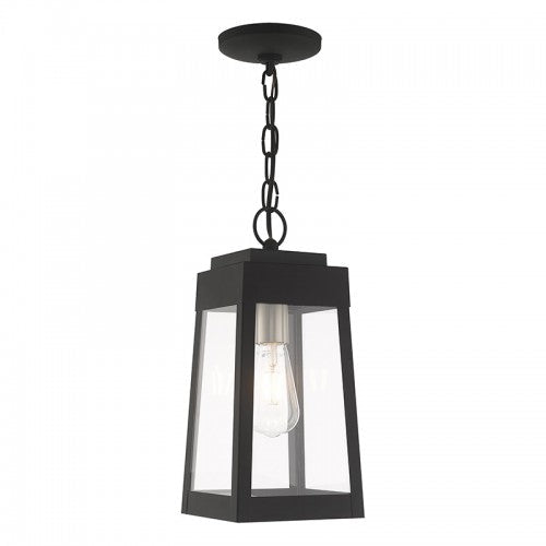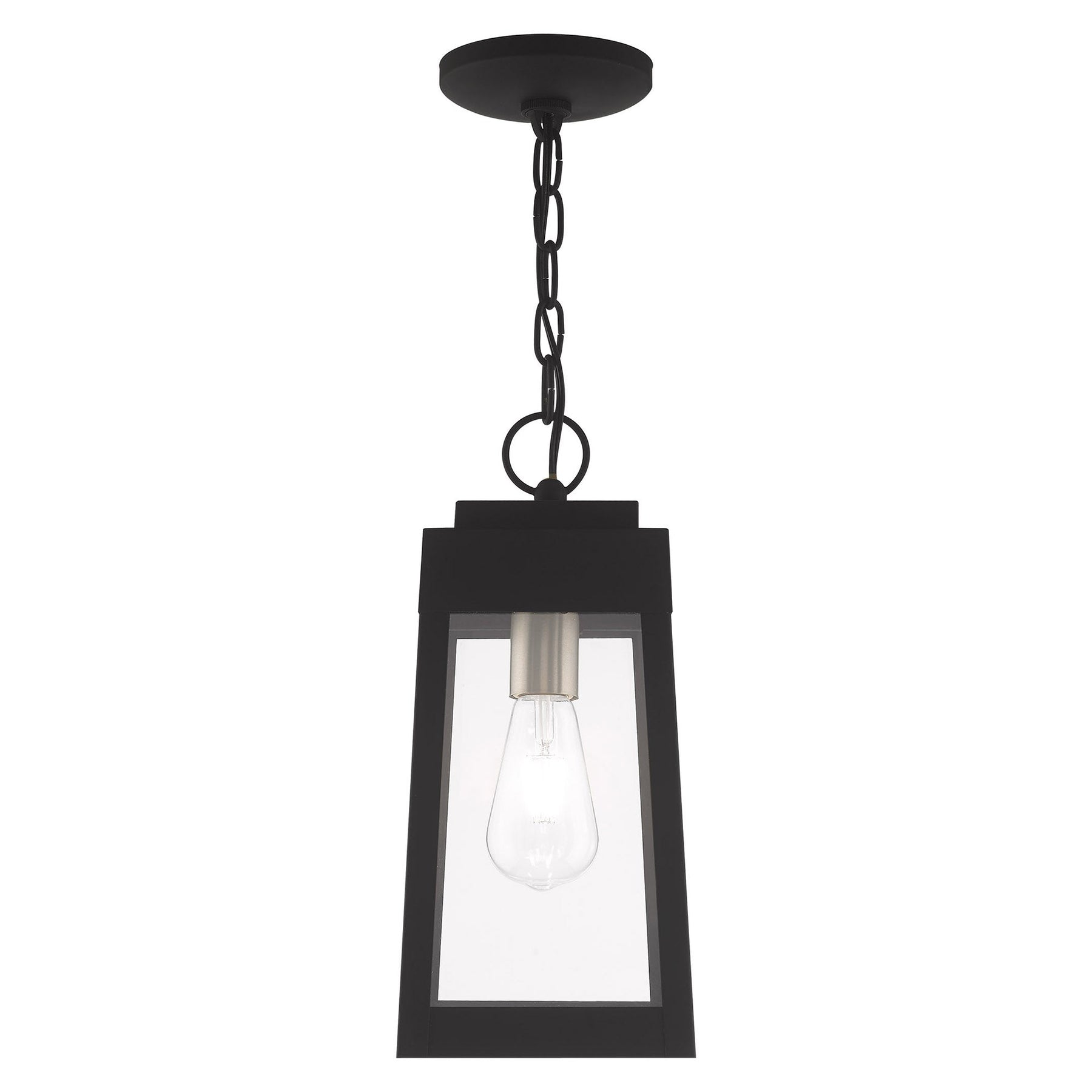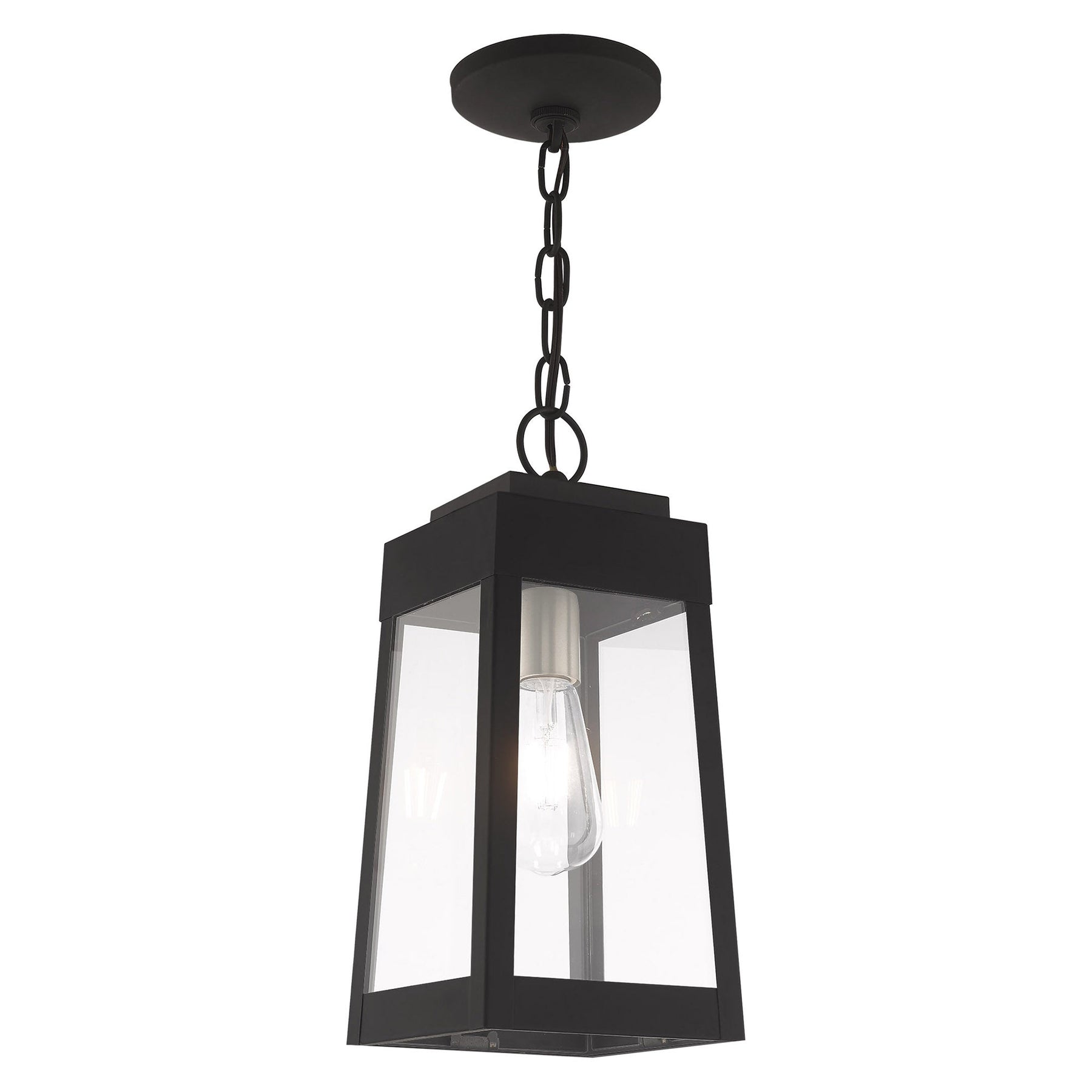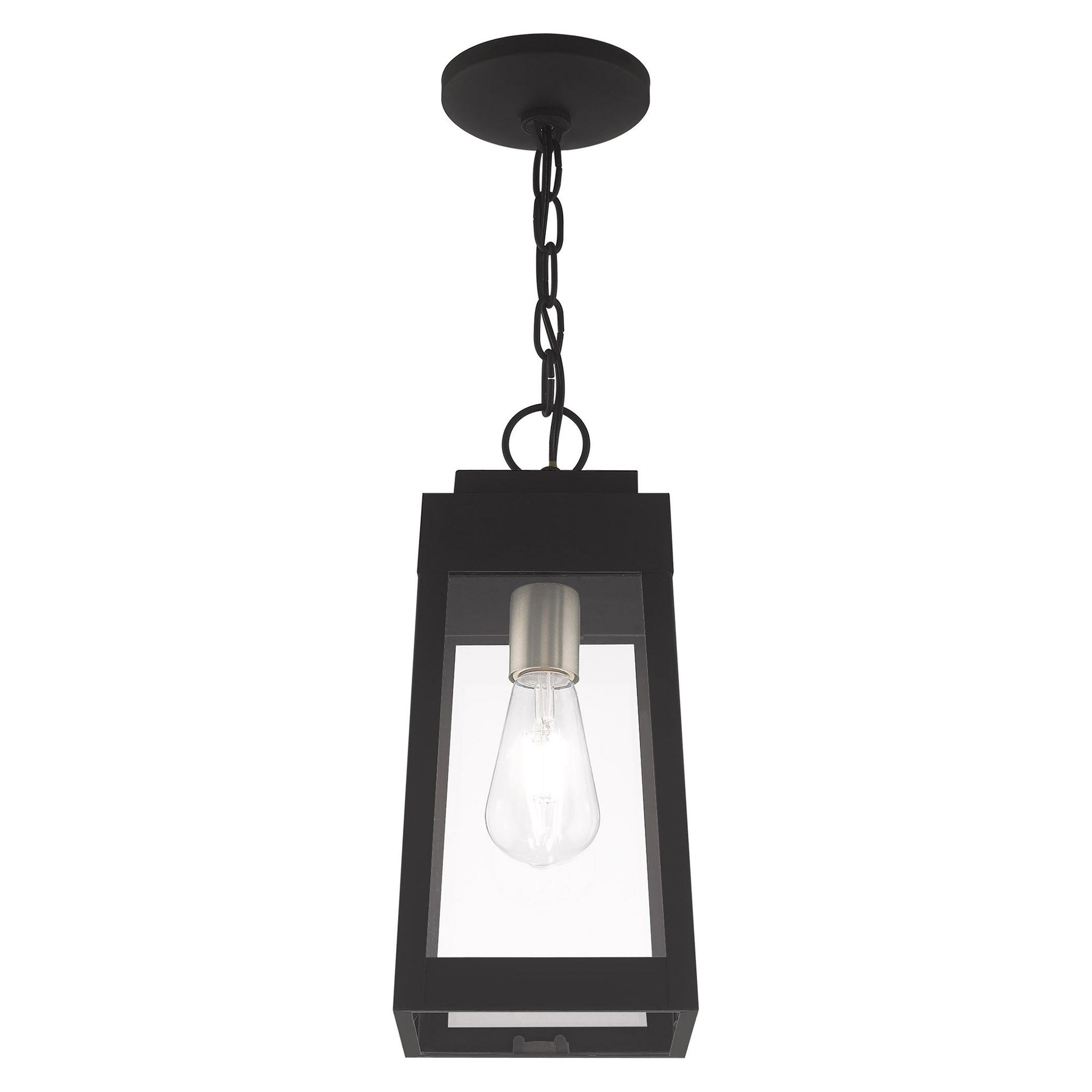The 20854-04 Oslo Outdoor Pendant Lantern seamlessly blends updated industrial design with classic materials. Crafted from hand-finished solid brass with a sleek black frame, this fixture stands 14.5 inches tall and has a width and length of 6.25 inches. It features clear glass panels that showcase the brushed nickel accents and accommodate one medium base bulb with a maximum wattage of 100W (bulb not included). With a 3-foot chain and 8-foot wire, this transitional style lantern is suitable for damp locations, making it an elegant choice for outdoor spaces.