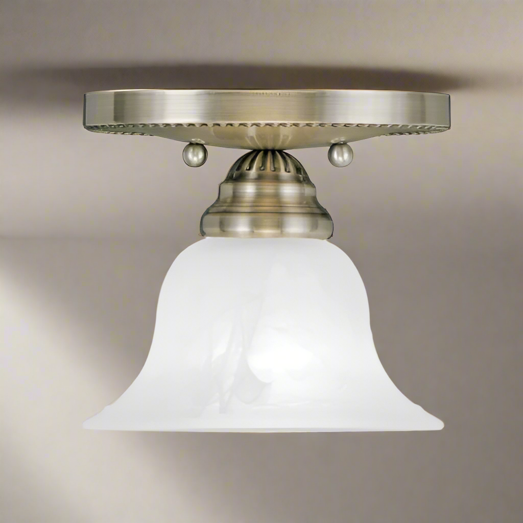 The Edgemont 1530-01 Ceiling Mount fixture is a stunning addition to any traditional decor. This one-light flush mount is beautifully crafted with a sleek antique brass finish and features elegant white alabaster glass. It measures 6 inches in height and has a canopy size of 7 inches long by 5 inches wide. Designed for use with a medium base bulb (not included) with a maximum wattage of 100, this fixture is sure to provide ample illumination. Suitable for damp locations, the Edgemont collection seamlessly blends form and function, enhancing the ambience of any room.