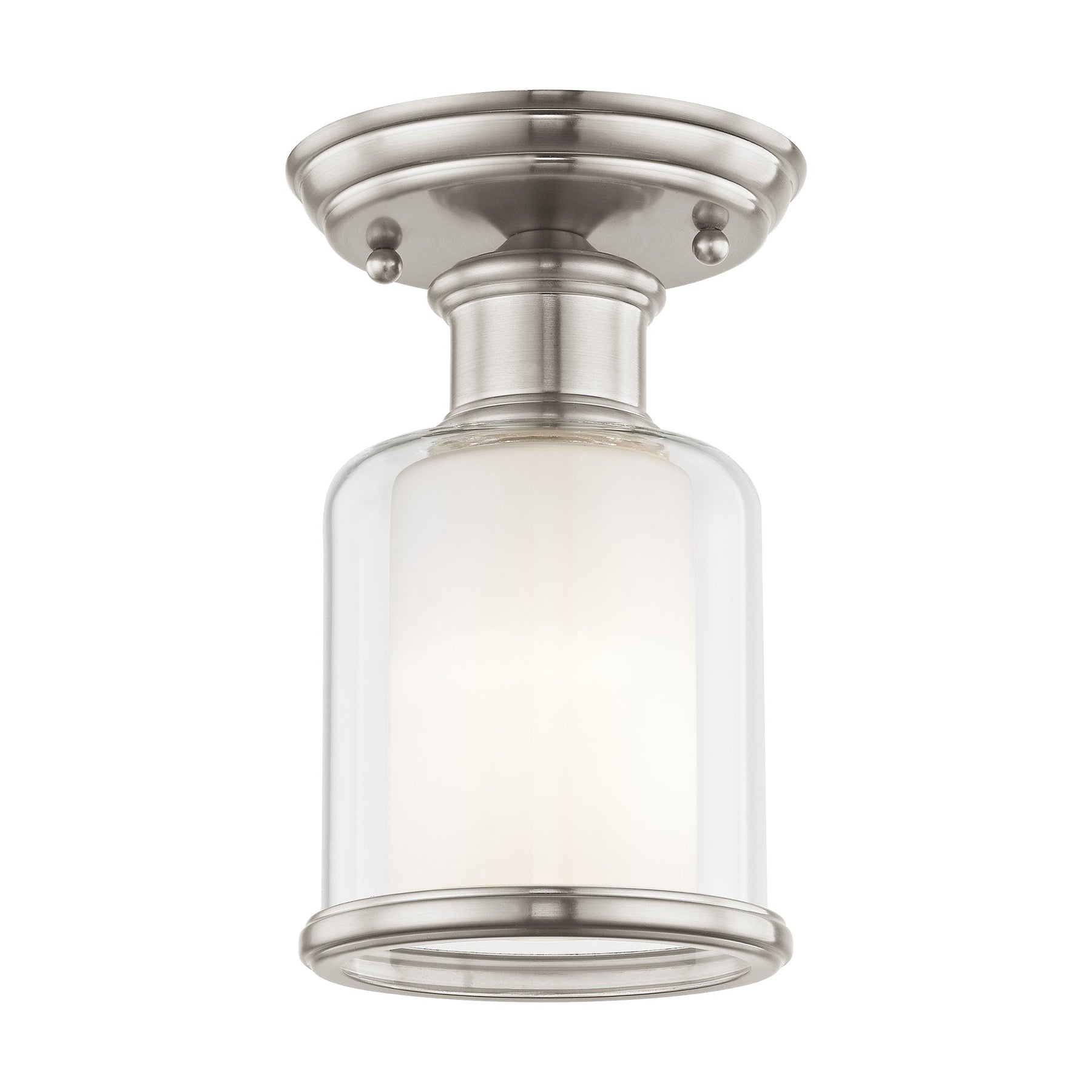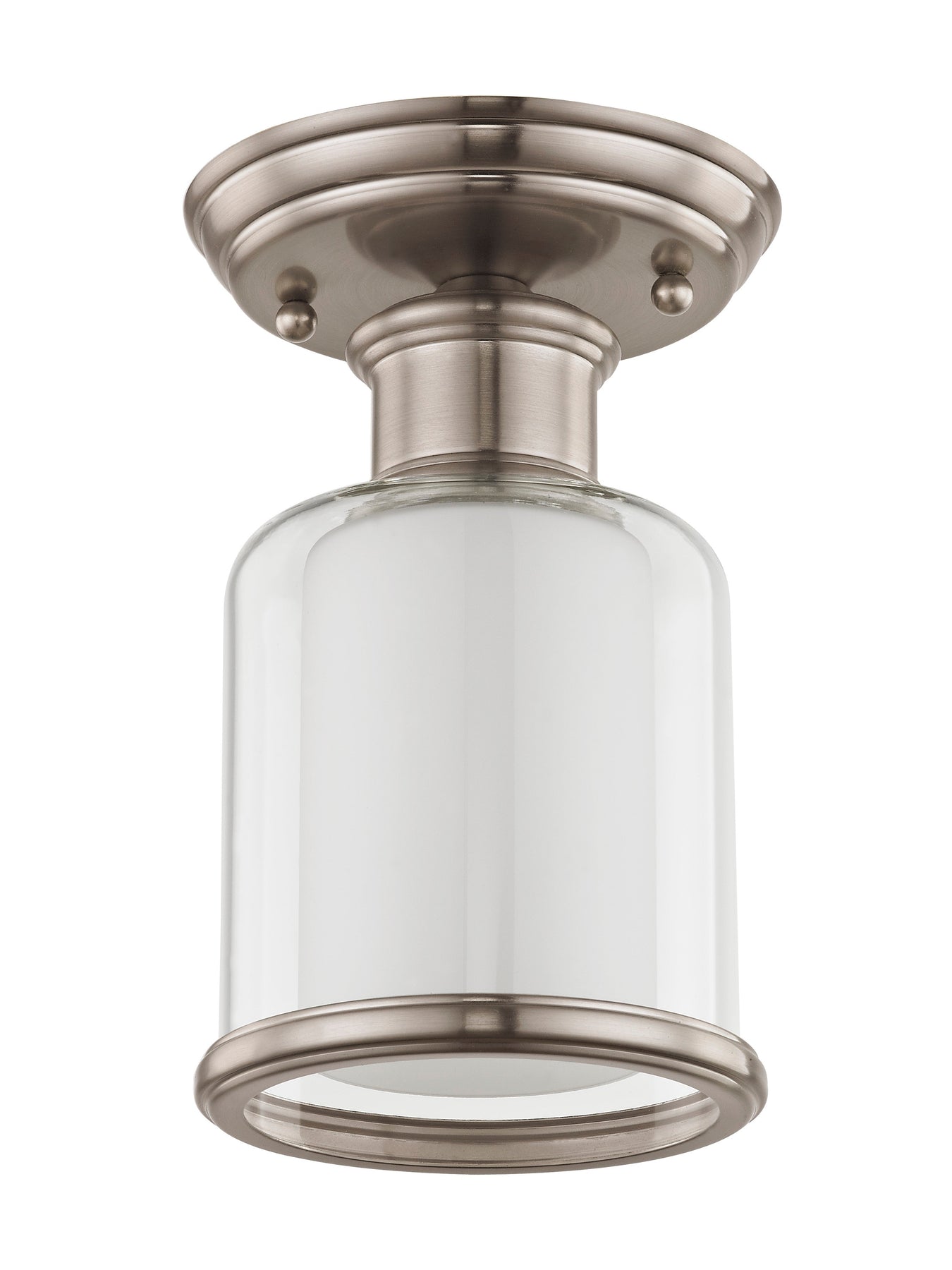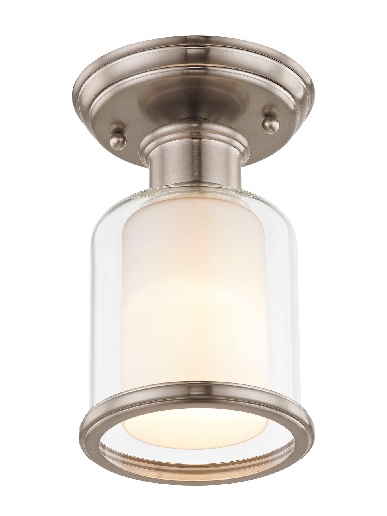 The Middlebush 40200-91 Ceiling Mount fixture is a splendid choice for those looking to enhance their home with a blend of traditional and modern aesthetics. This elegant flush mount features a height of 8.75 inches and a diameter of 5.5 inches, crafted from durable steel and finished in brushed nickel. It showcases hand-crafted clear glass on the outside with a satin opal white glass interior, creating a warm and inviting glow. Designed for one medium base bulb (not included) with a maximum wattage of 60W, it is ideally suited for damp locations, making it a versatile lighting option for various areas in your home.