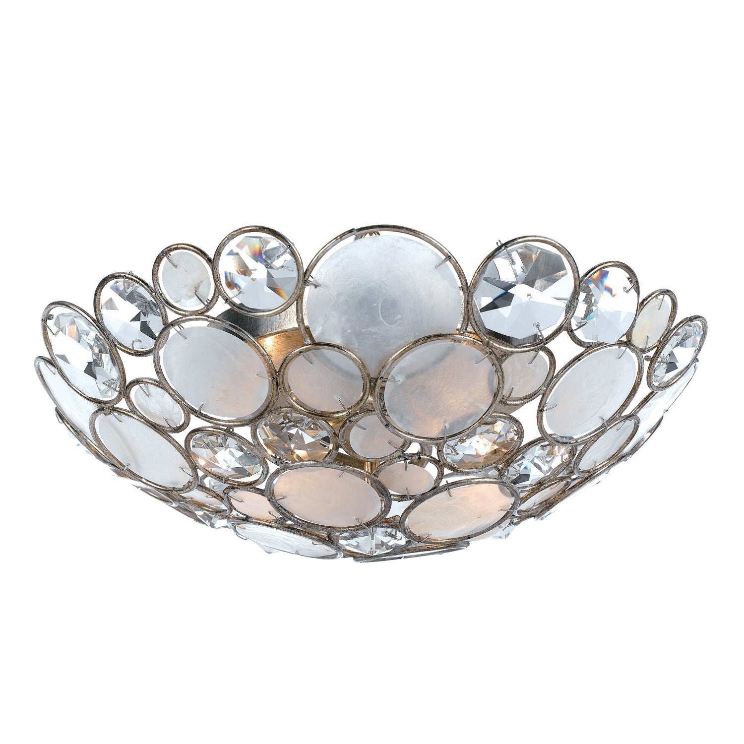 The Palla Collection is an organic mix of glamour and elegance. Each frame is fitted with hand pinned organic, natural textured Capiz shells and faceted cut crystal jewels inside overlapping metal circles giving depth and dimension. Whether the look is rustic, boho, or a coastal vibe, this light is as versatile as it is stylish.