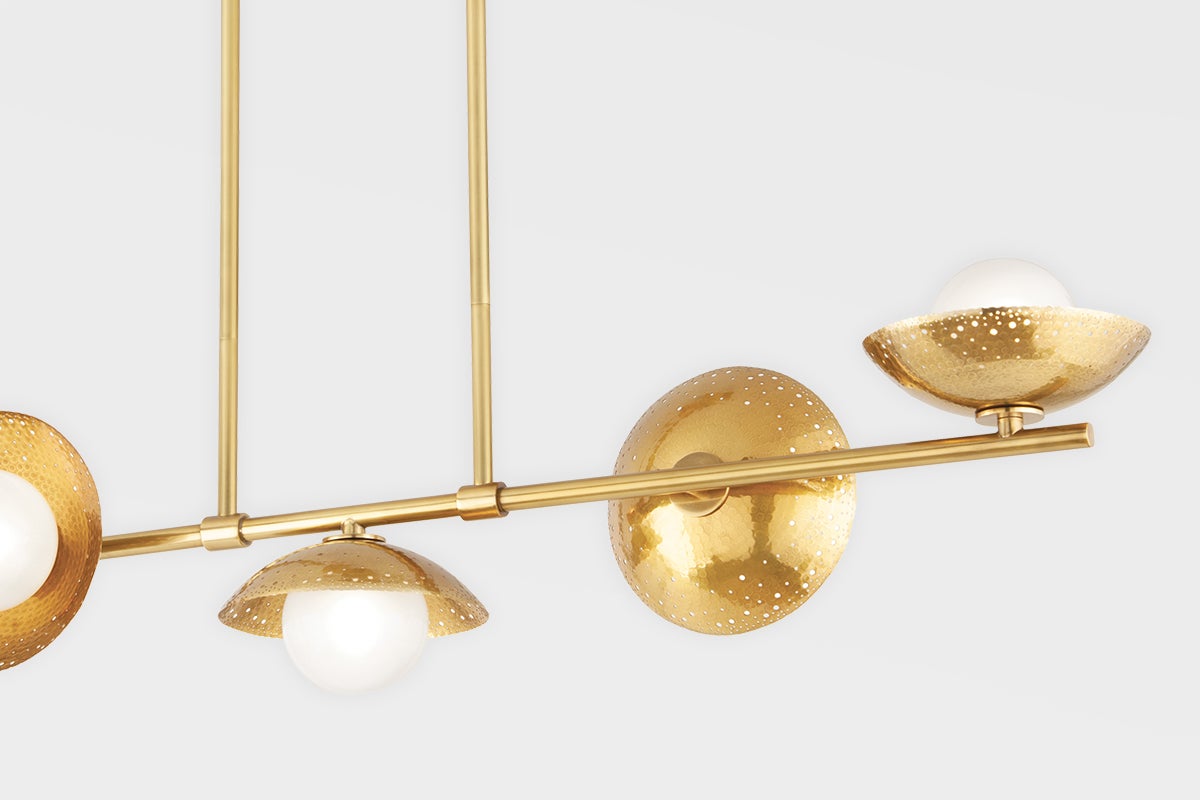 The Glimmer Chandelier by Hudson Valley Lighting is a stunning fixture that effortlessly combines elegance and functionality. This chandelier features five G9 socket type lamps, each with a maximum wattage of 4.00W, and is recommended to use G9 LED bulbs for optimal brightness and efficiency. With a width and diameter of 8.00 inches, a height of 10.00 inches, and an overall length of 50.00 inches, it makes a striking statement in any room. The chandelier also boasts an 8.00-inch extension and comes in an Aged Brass finish, adding a touch of sophistication. Designed to be installed in dry locations, it showcases a UL Damp rating, ensuring its durability in varied environments.