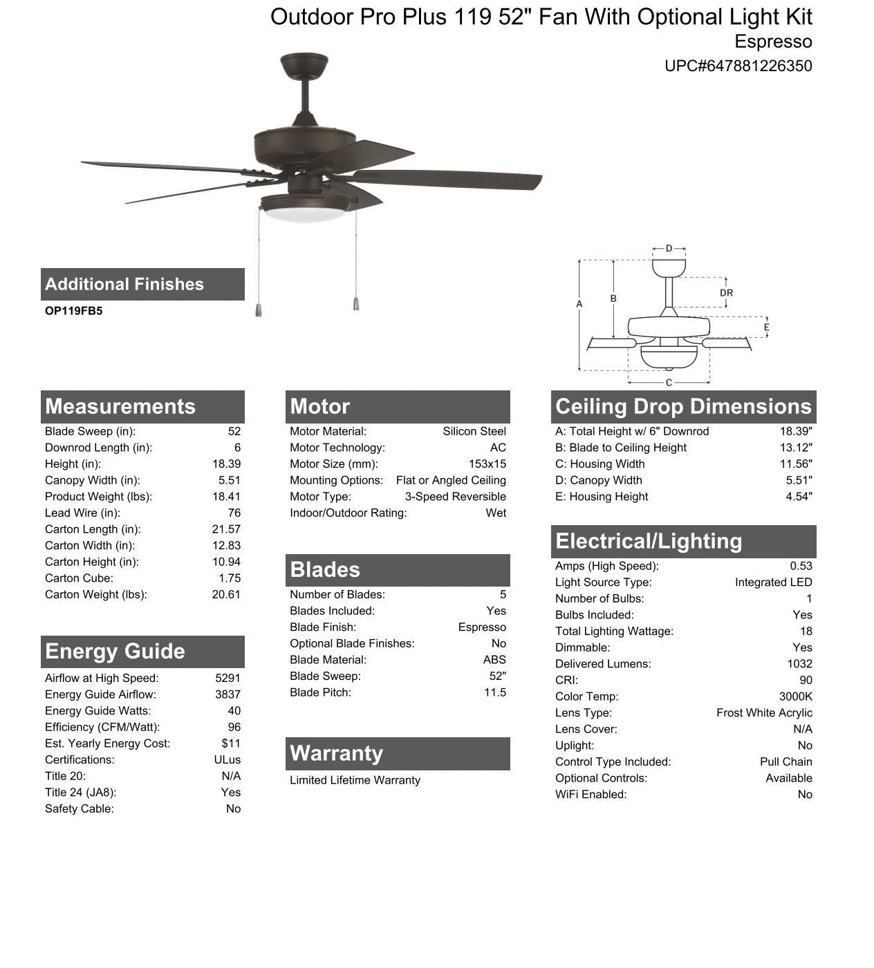 52" Outdoor Pro Plus 119 in Espresso w/ Matte Espresso Blades