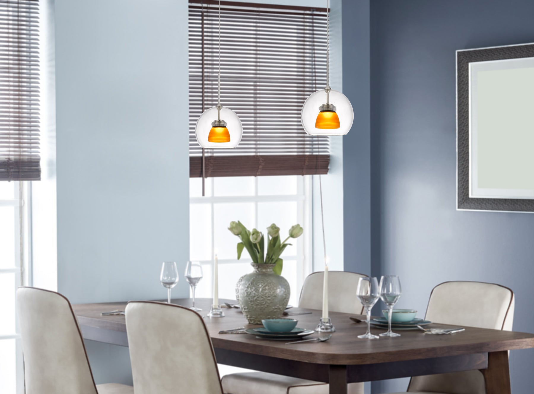 The UP-335-CL-AMBFR Integrated Dimmable LED Glass Mini Pendant Light is a stylish addition to any space, featuring a unique double-shaded design with a durable glass outer shade and a polycarbonate inner shade. This mini pendant delivers 450 lumens of warm 3000K light while consuming only 6W of energy. It is dimmable with compatible Lutron brand dimmers, providing versatility in lighting levels. With a minor assembly requirement, this product comes with a three-year warranty and includes a canopy and a replaceable driver, ensuring both quality and ease of installation.