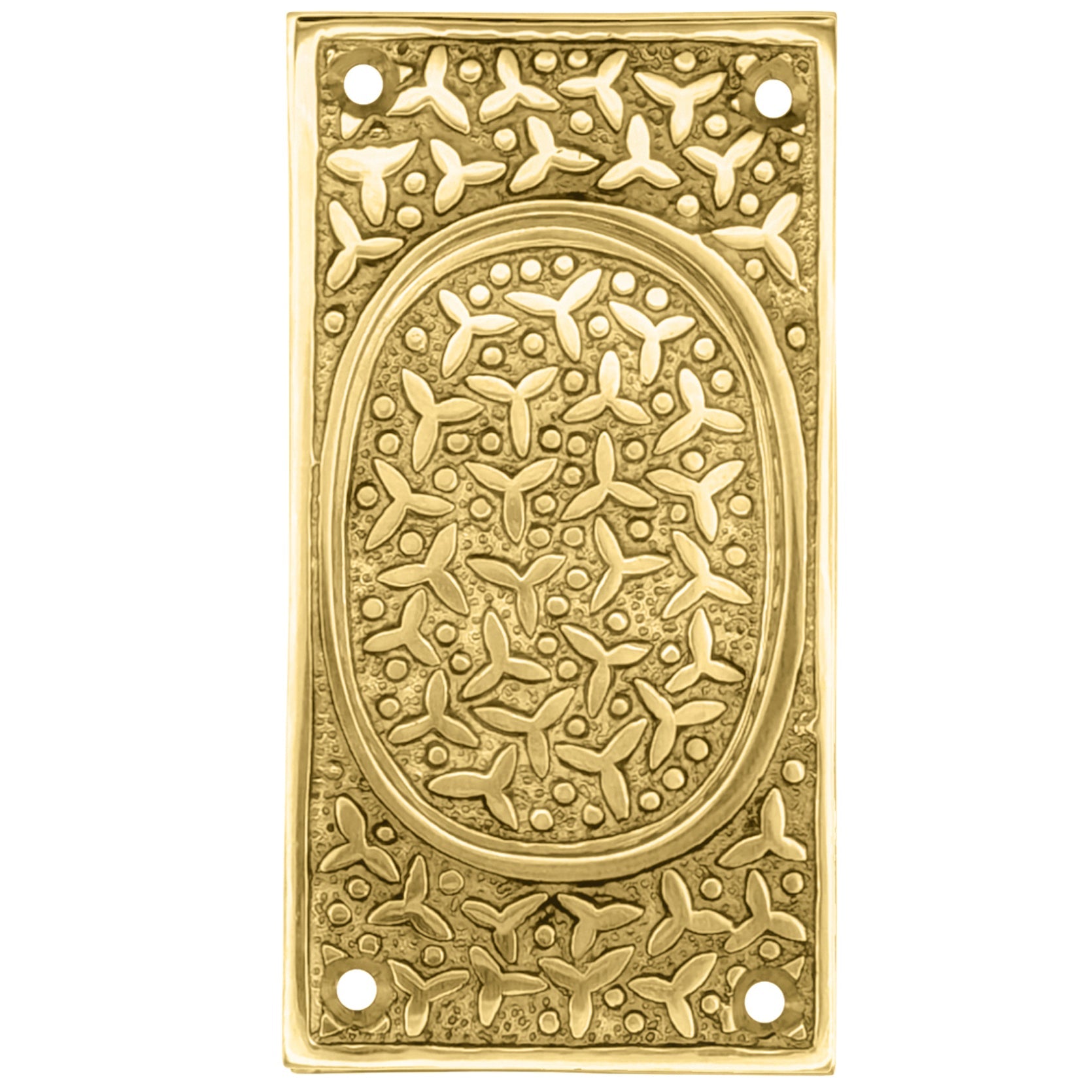 Measuring approximately 4 1/5 inches tall by 2 1/4 inch wide and crafted from solid brass, this detailed hardware piece comes complete with complementary screws, ensuring easy installation with all the necessary mounting hardware included. For a flush finish, routing may be necessary.