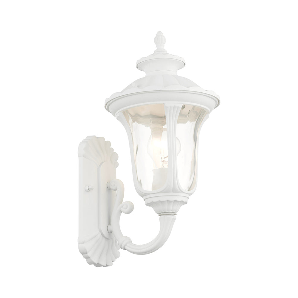 The 7850-13 Oxford Outdoor Wall Lantern is a charming addition for those desiring a touch of traditional elegance. This fixture features a textured white finish and showcases a single upward-facing light design, requiring one medium base bulb with a maximum wattage of 100W (bulb not included). With a width of 7.25 inches and a height of 15.5 inches, it has an 8.75-inch extension, making it ideal for various outdoor settings. Crafted from durable aluminum and adorned with hand-blown clear water glass, this lantern is suitable for both damp and wet locations, enhancing the curb appeal of any home with its vintage charm.