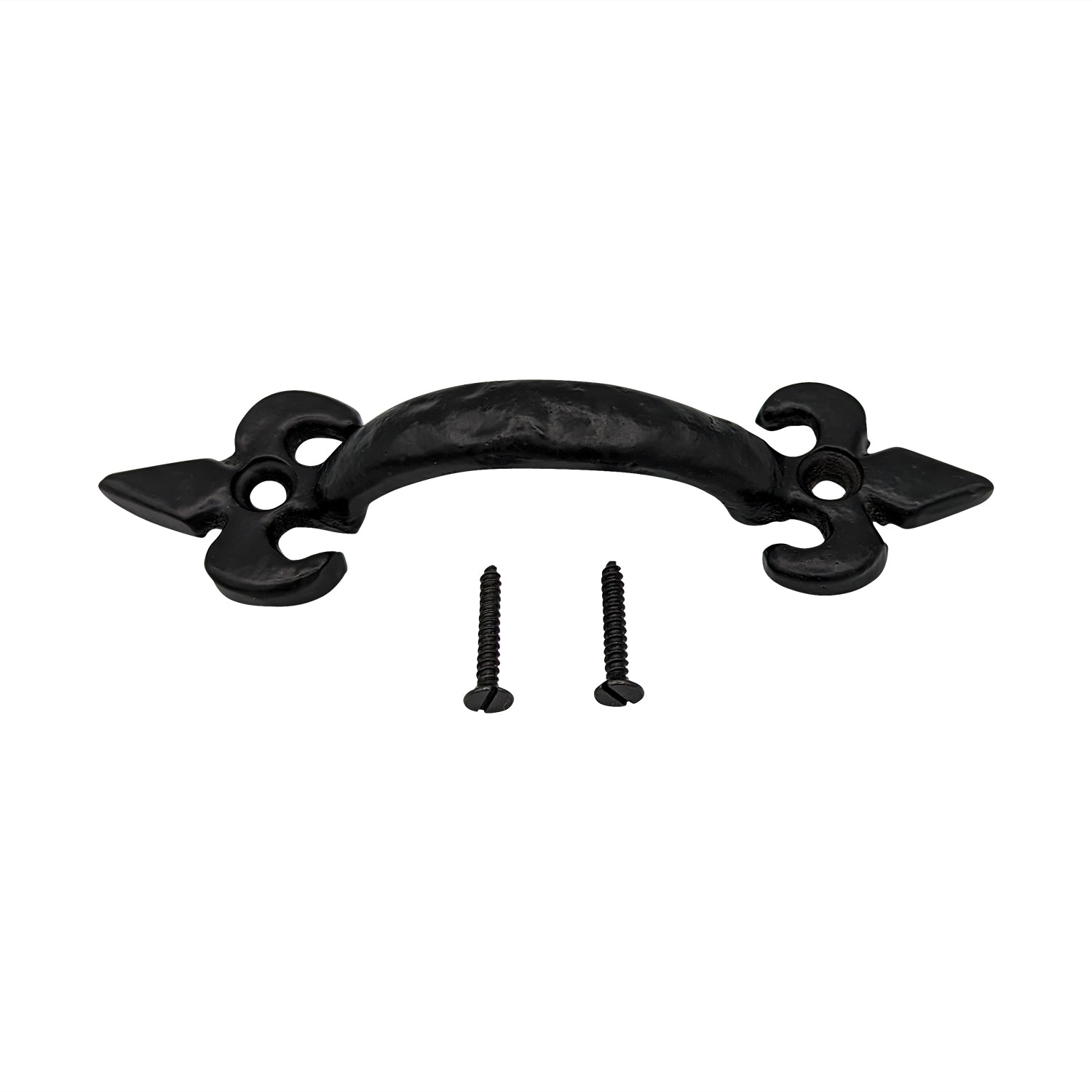 4 1/4 Inch Solid Brass Colonial Style Pull (Flat Black Finish) - Measures 4 1/4 inch long with a projection of approximately 0.6 inches and a center to center mounting distance of approximately 2 3/4 inches. Mounting screws included. Comes complete with mounting hardware. This is made from Solid Iron and it comes in a Matte Black rough iron finish.