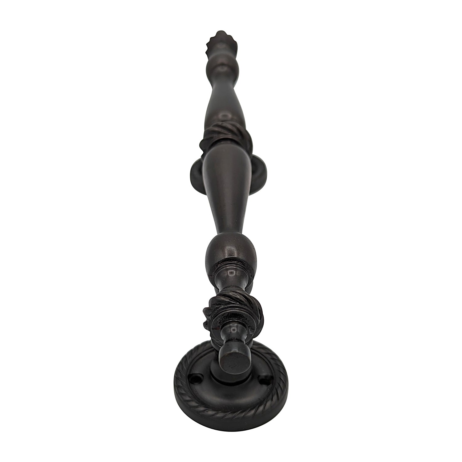 This handle has solid brass construction. It measures approximately 9 1/2 Inches long (245 mm) by 1 3/4 Inches Wide (44 mm) with a projection of 2 1/2 inches. The center to center mounting distance is approximately 6 inches.