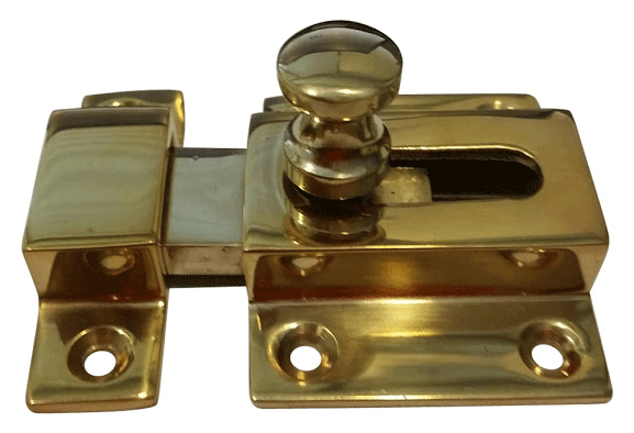 2 1/4 Inch Solid Brass Cabinet Latch With Round Turn Piece (Polished Brass Finish) - Measures 2 1/4 inches by 1 1/2 inches overall. The base measures 1 5/8 inches by 2 inches tall. The catch measures approximately 5/8 inch by 2 inches tall. This product comes in a polished brass finish. Works with both left hand and right hand doors and this comes complete with the mounting hardware. The slide latch tongue protrudes 1/2 of an inch.