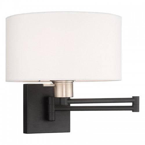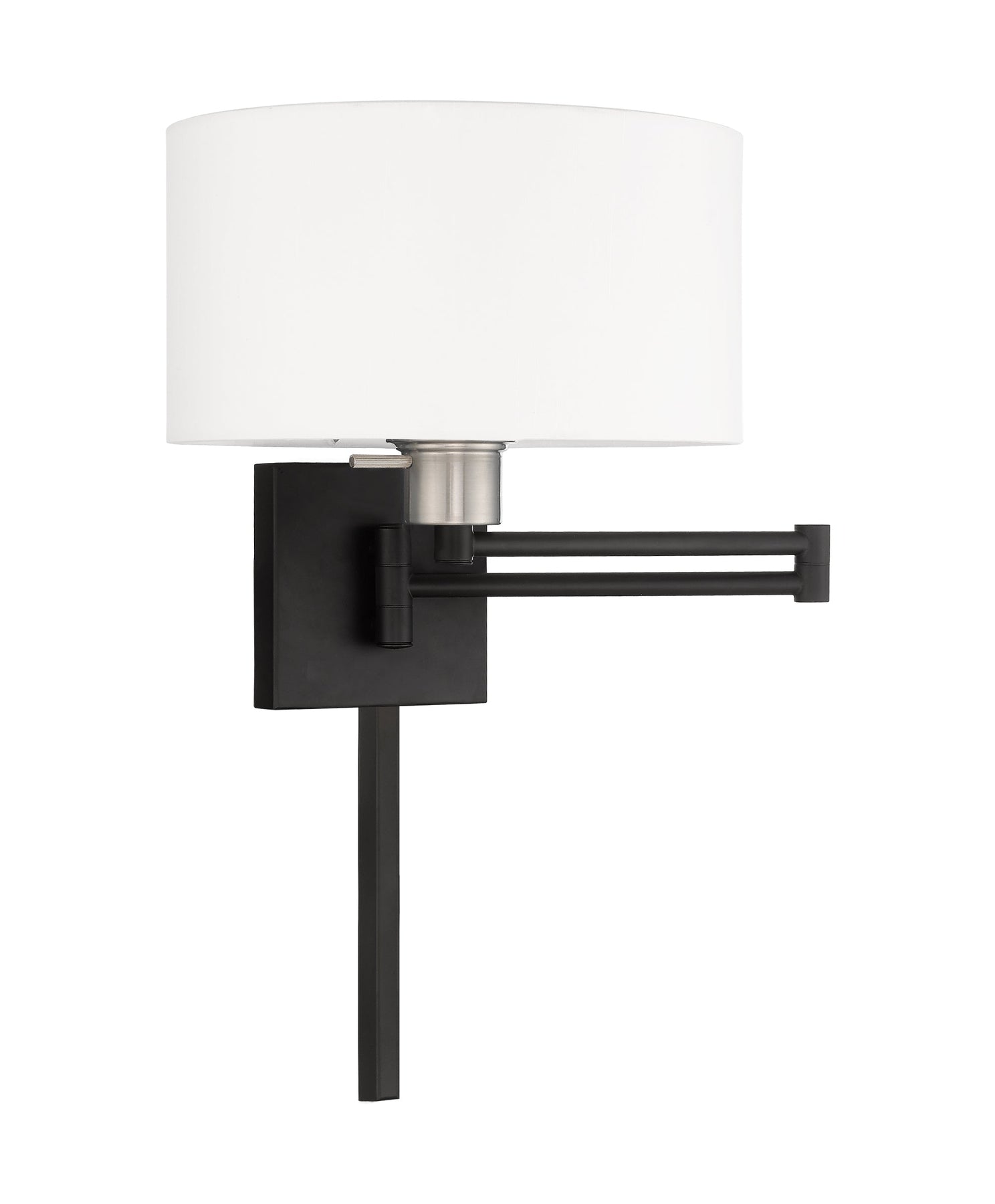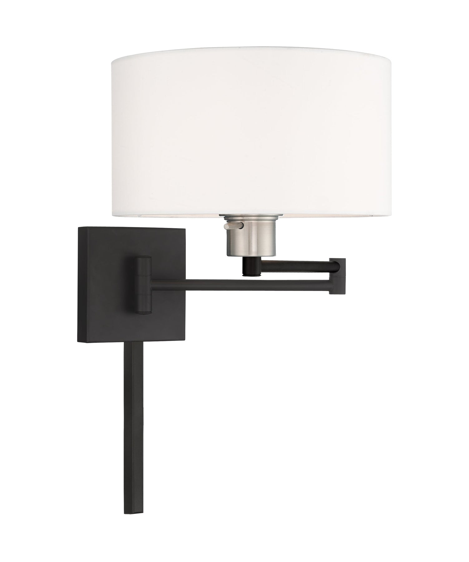 The 40036-04 Swing Arm Wall Lamp is a versatile lighting fixture ideal for placement beside a bed or above your favorite reading chair. It features a sleek black finish complemented by brushed nickel accents, making it a perfect example of transitional design. The lamp measures 11 inches in both width and height, with an extension of 24.25 inches, allowing for adjustable positioning. Accommodating a single medium base bulb with a maximum wattage of 100, this fixture includes a hand-crafted off-white fabric hardback shade that elegantly diffuses light. Additionally, it is suitable for damp locations, includes a 3-way switch for ease of use, and comes with two 12-inch cord covers. Whether plugged in or hardwired, this lamp marries functionality with style.