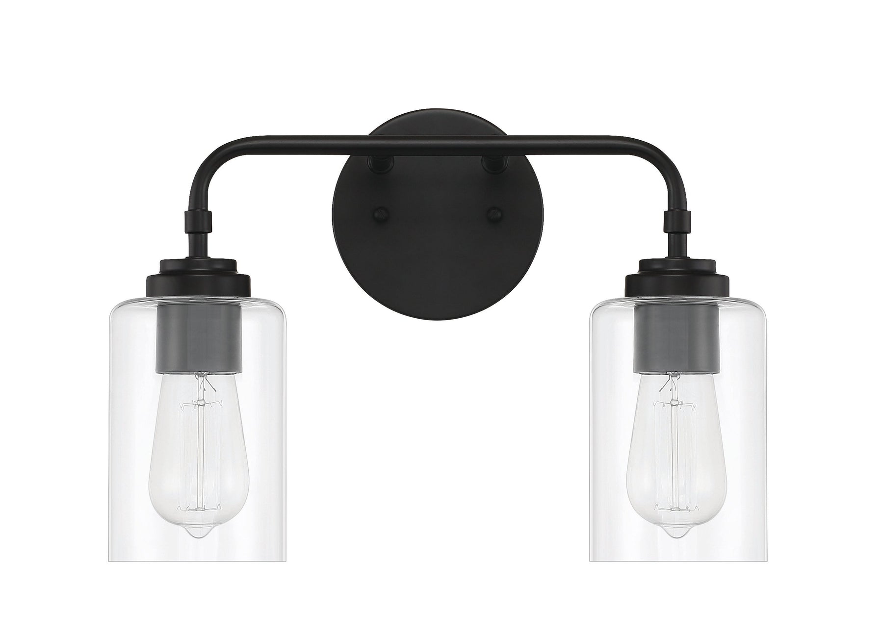 The Stowe 2 Light Vanity in Flat Black is a perfect addition for those desiring a sophisticated yet inviting atmosphere in their space. This vanity requires two medium base 60 watt bulbs (not included) and features stylish clear glass accents. With dimensions of 15 inches in width, 10.75 inches in height, and a depth of 15 inches, it has a sleek extension of 6.50 inches. The fixture is UL Damp rated, making it suitable for use in bathrooms or other humid areas, ensuring both style and safety.