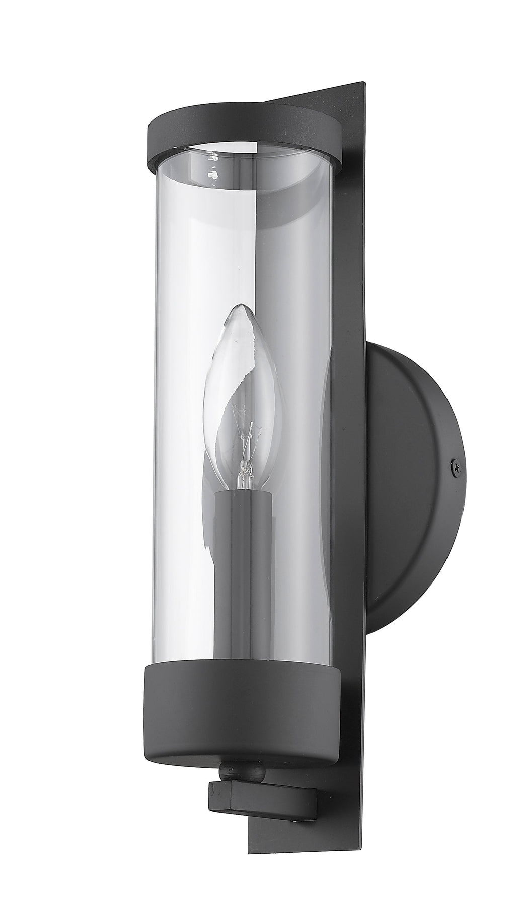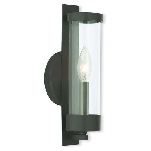 The Castleton Wall Sconce in Bronze is a sophisticated addition to any modern interior. This stylish fixture features a clear glass cylinder framed by sleek bronze steel straps, providing a clean and contemporary look. It requires one candelabra base bulb (not included) with a maximum wattage of 60W. Measuring 4.75 inches in width and 12 inches in height, with a 4-inch extension, this sconce is designed for damp locations, making it a versatile choice for various settings while maintaining your minimalist aesthetic.