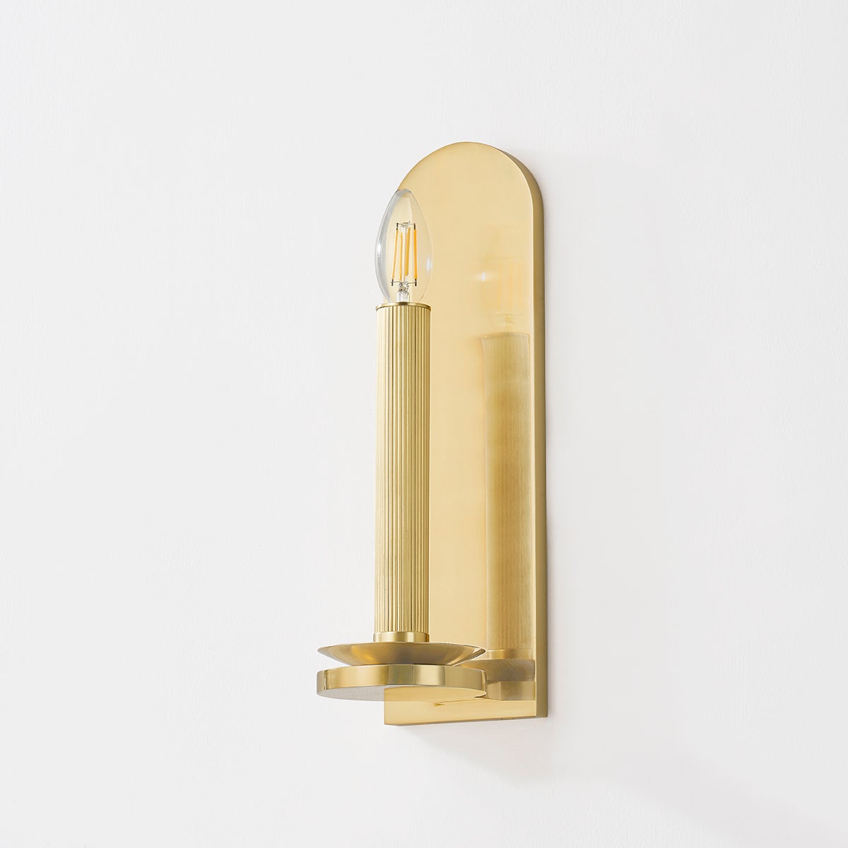 The Lindenhurst Wall Sconce by Hudson Valley Lighting combines elegant design with functional lighting. Measuring 4.25 inches in width, 14 inches in height, and extending 4.75 inches from the wall, this stylish sconce features a single E12 candelabra base socket. It supports a recommended B11 bulb with a wattage of 8.00, providing ample illumination. The sconce is finished in a sophisticated Aged Brass (AGB) and is UL Damp rated, making it suitable for use in bathrooms and other moisture-prone areas.