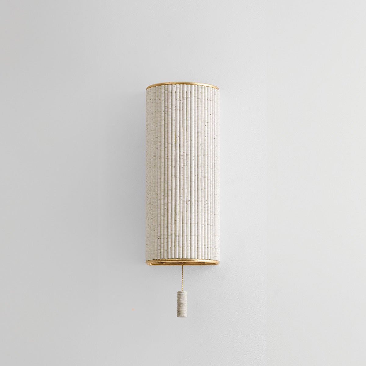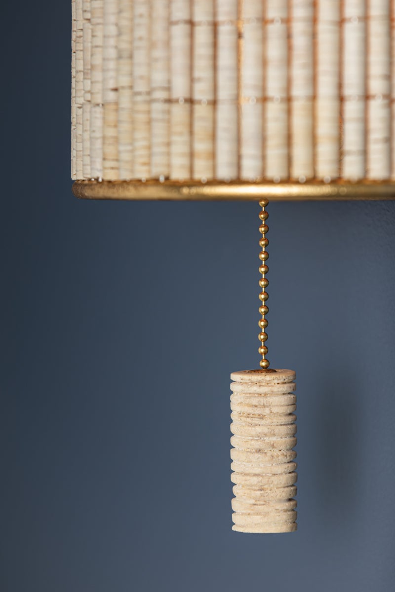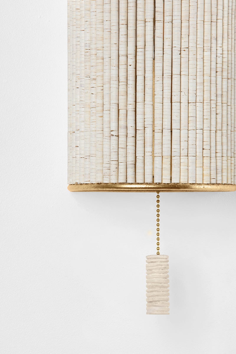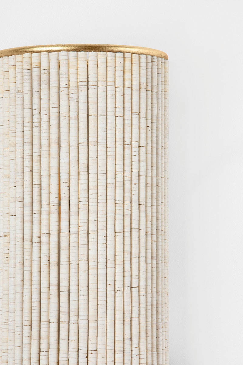 The Hampden Wall Sconce by Hudson Valley Lighting is a stunning addition to any contemporary decor, featuring a chic shade made of COCO beads. With a width of 5.75 inches and a height of 18 inches, this sconce provides a striking visual while extending 3.75 inches from the wall. It accommodates one medium E26 base bulb (not included) with a maximum wattage of 15W and is recommended for use with a T10-9 bulb. This elegant light fixture is finished in Vintage Gold Leaf and is rated for UL Damp locations, making it suitable for use in bathrooms or other areas with moisture.