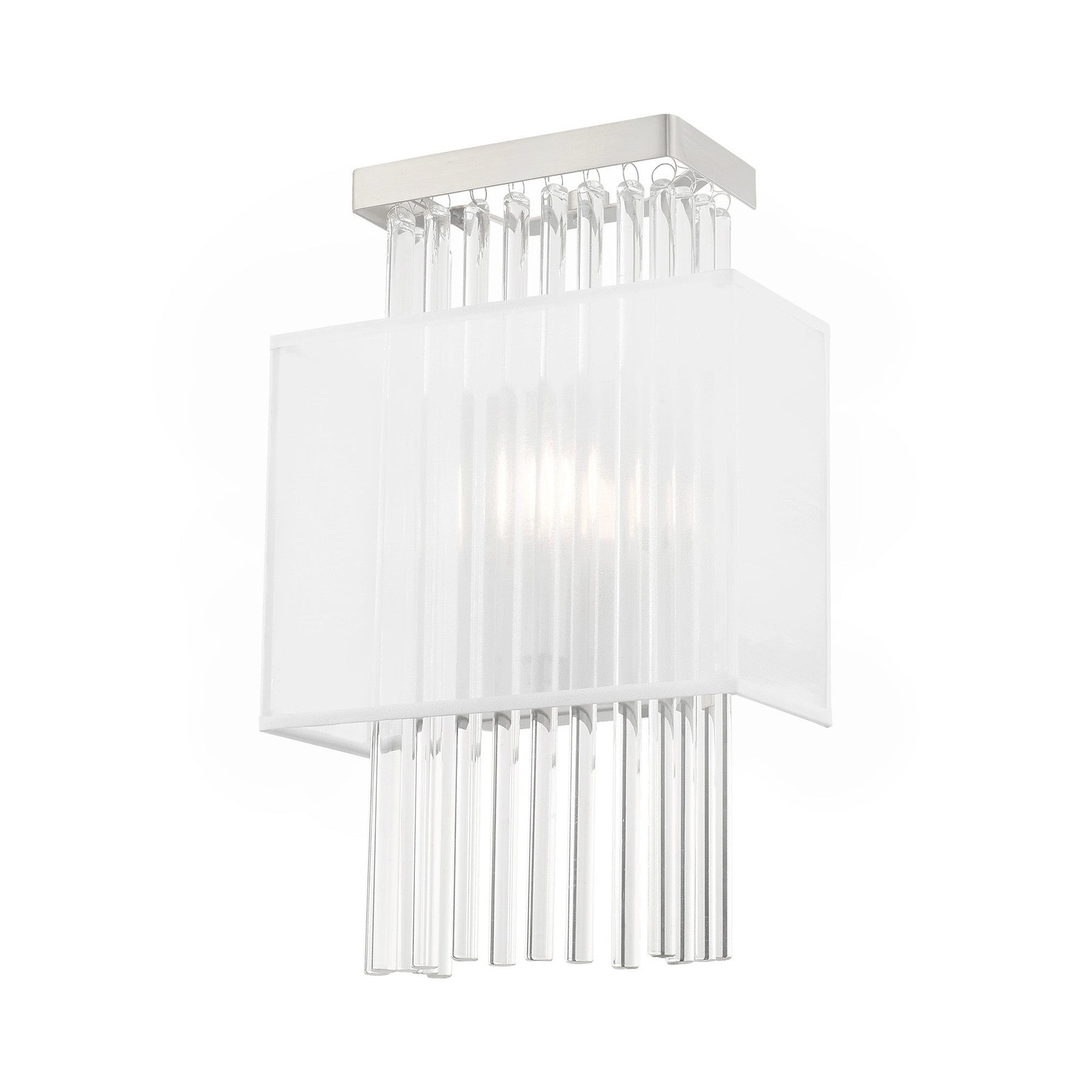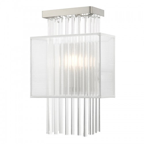 The Alexis Wall Sconce, item number 41140-91, offers a chic lighting solution that enhances contemporary decor with its upscale design. This elegant fixture features a brushed nickel finish and is adorned with stunning grade-A K9 crystal rods, providing a striking visual appeal. It requires one candelabra base bulb (not included) with a maximum wattage of 40W. With dimensions of 9 inches in width, 14.5 inches in height, and a 3.95-inch extension, the Alexis is suitable for damp locations, making it a versatile choice for various spaces.
