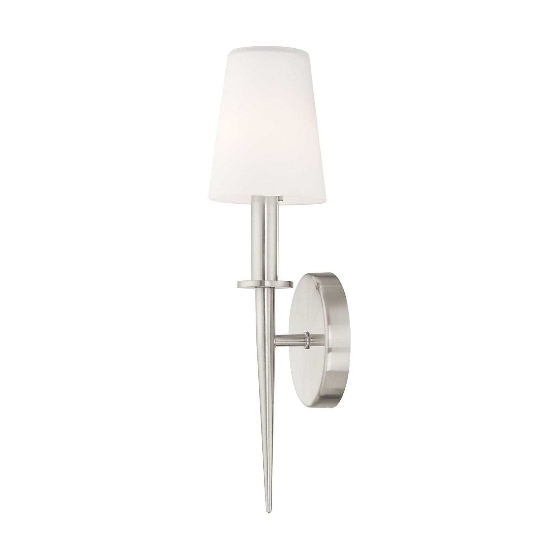 The Witten Wall Sconce in Brushed Nickel offers a contemporary touch to any space with its stylish design. Measuring 4.25 inches in width and 14.5 inches in height, this sconce features a hand-blown opal white glass shade that adds a sophisticated flair. It accommodates one candelabra base bulb (not included) with a maximum wattage of 60W. With an extension of 3.95 inches and rated for damp locations, the Witten is a versatile lighting choice suitable for various indoor settings.