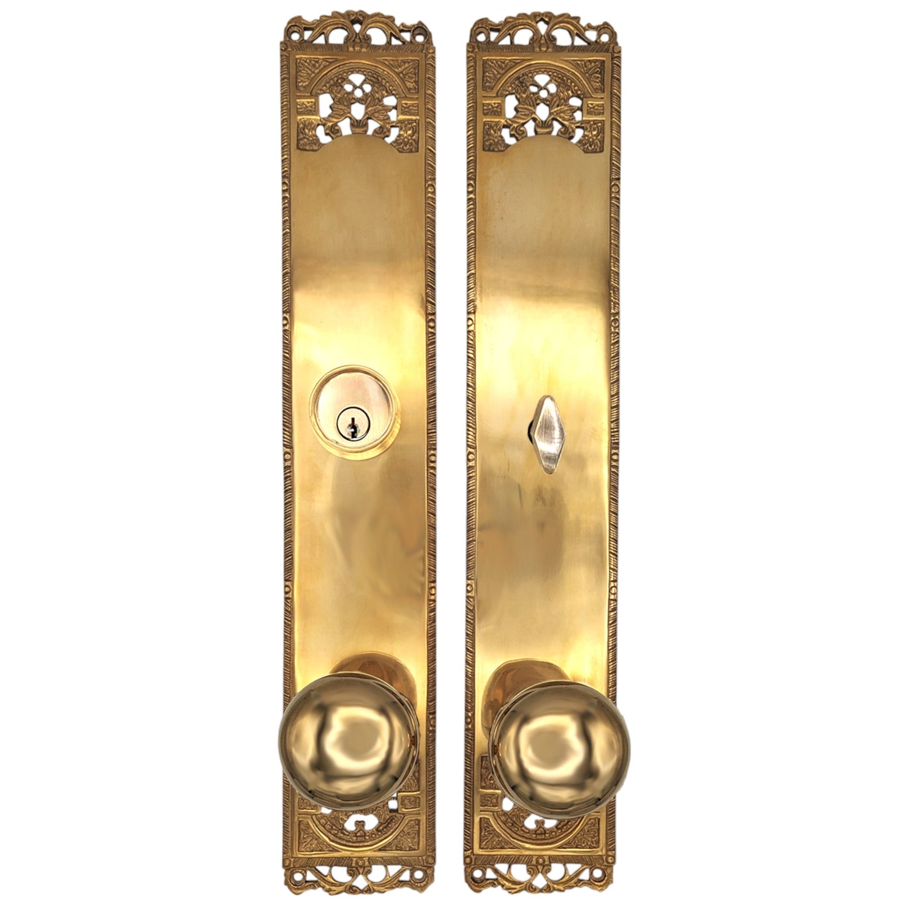 This entryway set is made from solid brass and measures 3 inches wide by 16 inches tall. Shown with the round brass knob. Other styles of knobs available at no additional charge. Entryway set deadbolt to knob center-to-center distance is 5.5 inches. Entryway backset comes as 2 3/8 inch standard and a 2 3/4 inch backset is available at no additional charge. This is a complete set and it comes with tubular latch mechanisms, strike plates, complete knob sets, internal mechanisms, deadbolts and all mounting hardware.