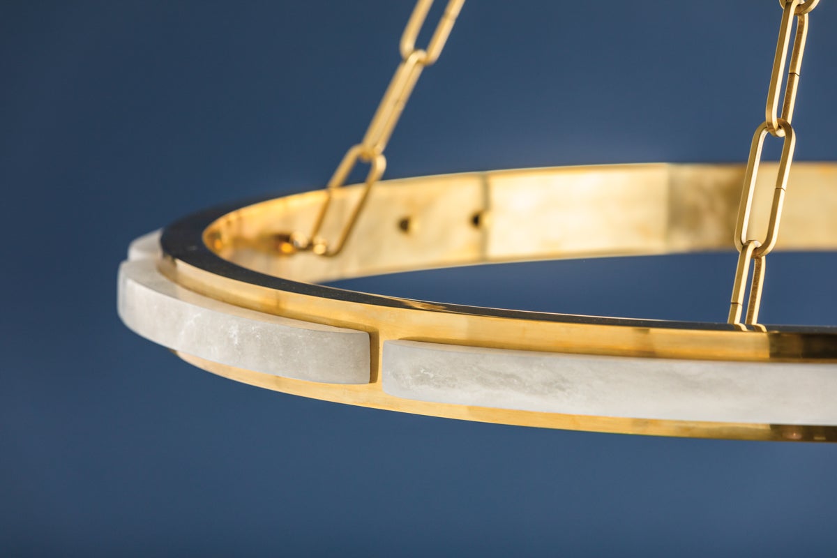 The Wingate pendant light by Hudson Valley Lighting features a stunning alabaster shade that offers a sophisticated touch to any space. With a diameter of 36 inches and a height of 2 inches, this fixture is ideal for larger rooms and makes a bold statement. It utilizes an integrated LED socket type, delivering a warm color temperature of 2700K and a high color rendering index (CRI) of 90, ensuring true-to-life color representation. Producing up to 1250 lumens with an 80W output, this damp-rated pendant is perfect for a variety of applications, from dining areas to living rooms. Available in an elegant Aged Brass finish, it combines both style and functionality, with field serviceable features to enhance its longevity.