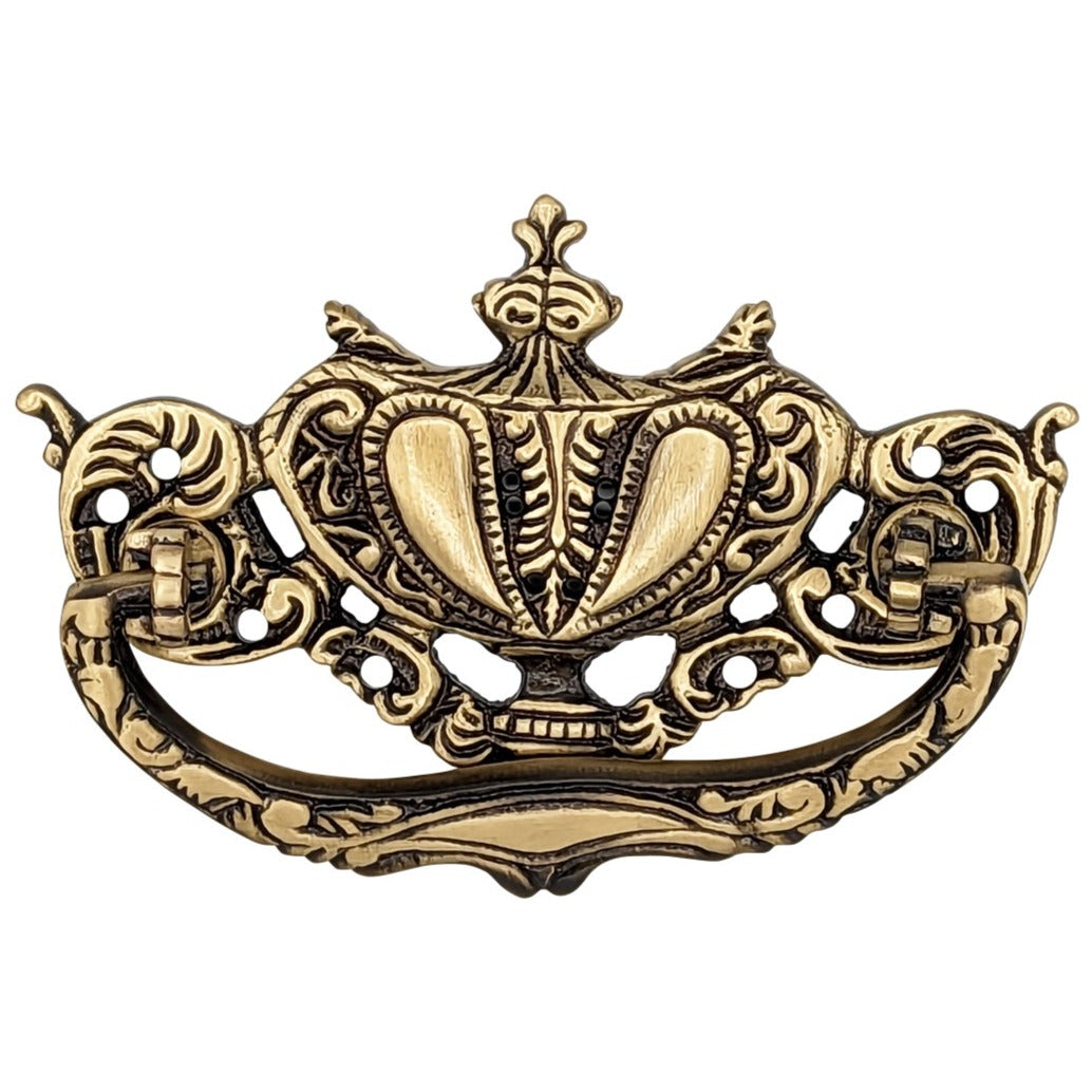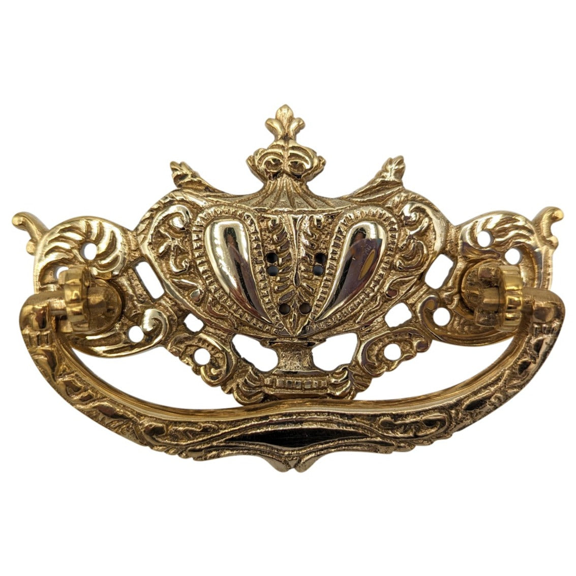 This bail pull measures approximately 4 1/4 inches long and by 2 1/2 inches tall with a 3 inch center to center measurement. This ornate bail pull is solid brass and comes with mounting hardware.