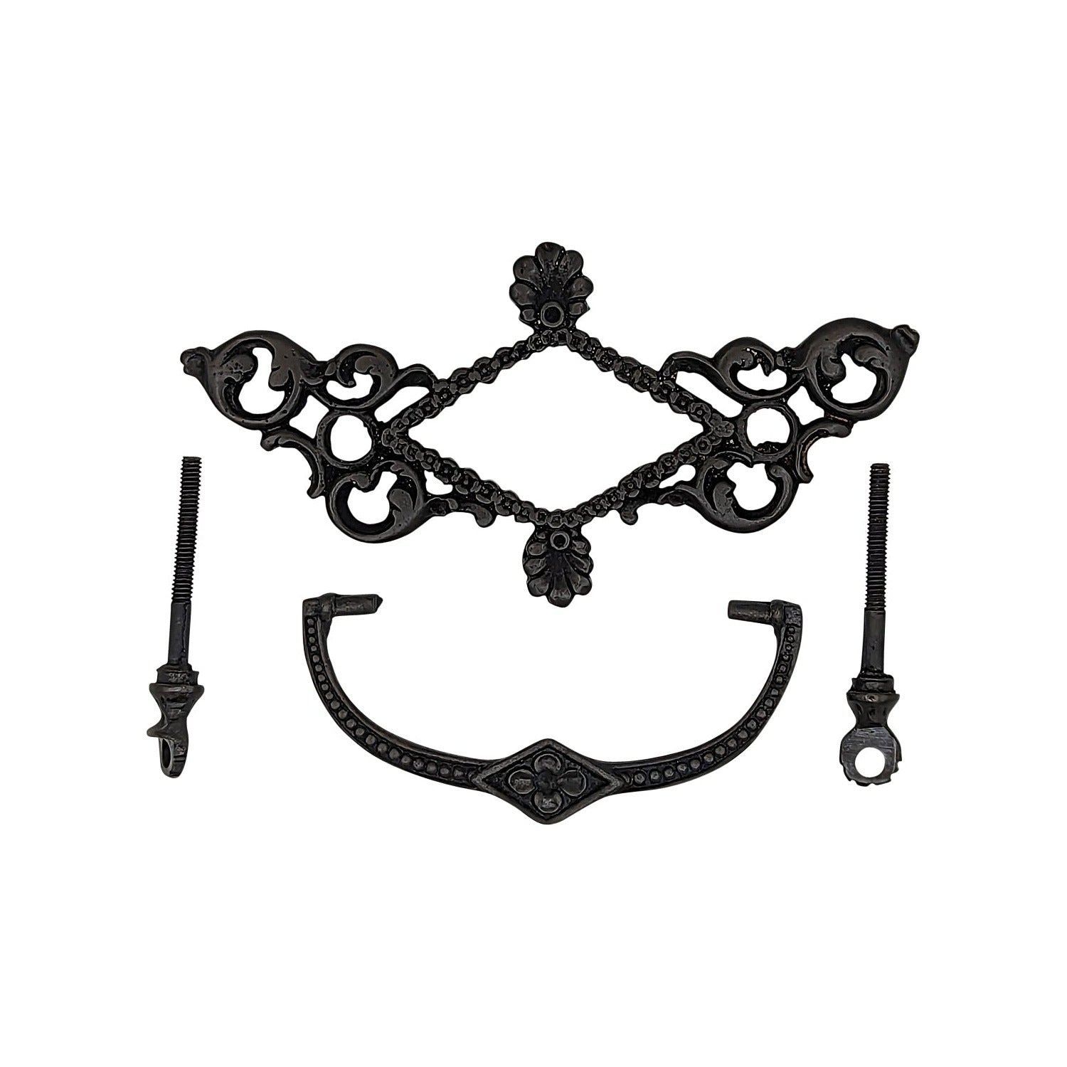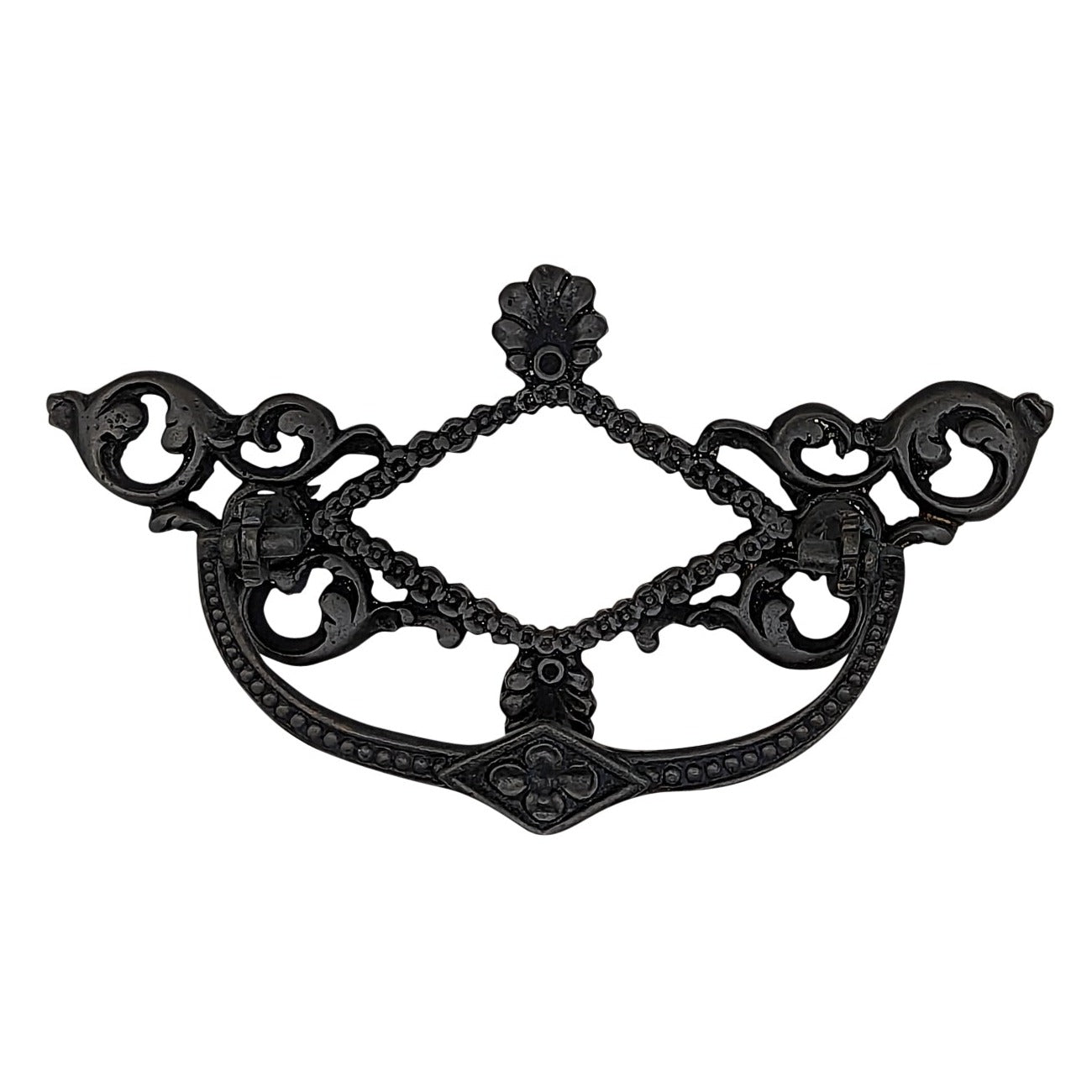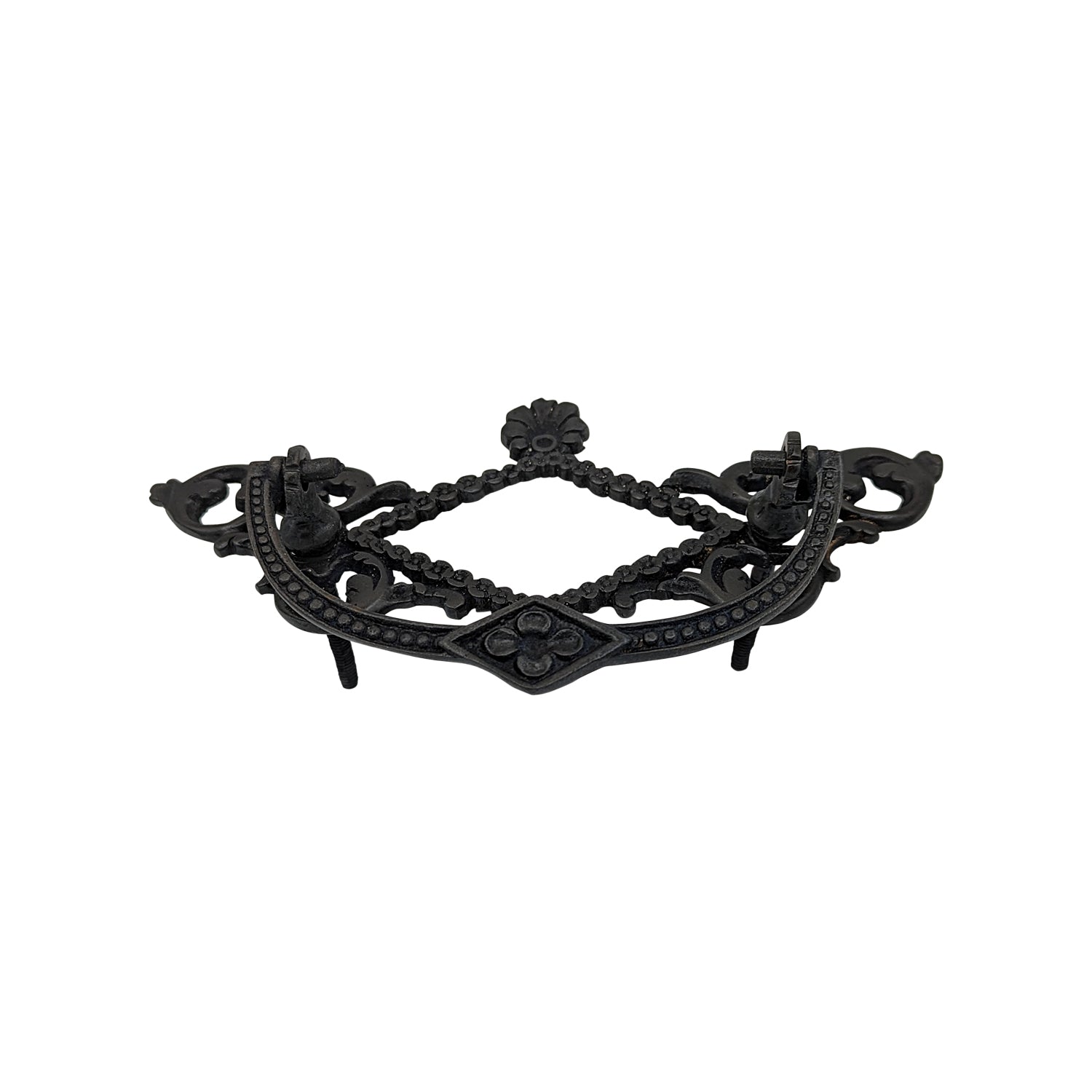 This bail features an ornate, Victorian design with detailed beading accents. It measures 5 1/5 inches long and 2 3/4 inches tall. The center to center mounting distance is 3 inches (3.00" c-c).