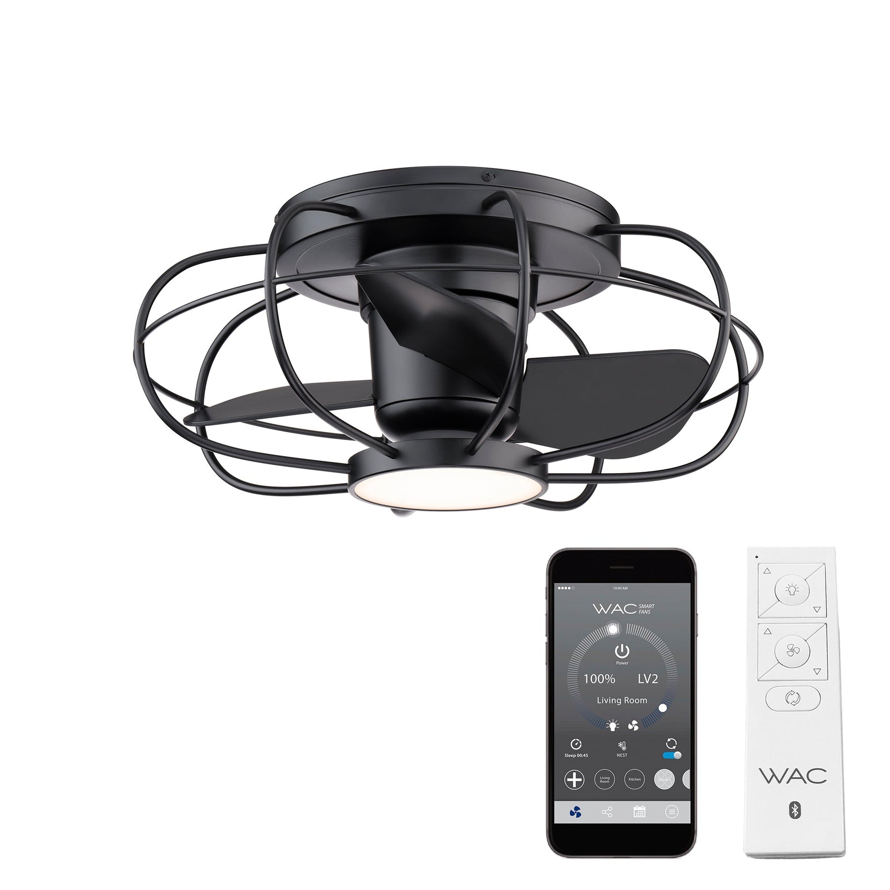 Aella Indoor or Outdoor 3-Blade 22in Smart Caged Ceiling Fan in Matte Black with 3000K LED Light Kit and Remote Control This caged smart fan renders a timeless style that will integrate into nearly any interior or exterior decor. Damp rated with three distinct finish offerings. Download the available app to take a great fan and make it smart. WAC Smart Fans can be controlled from the WAC Smart Fan app, enabling smart features and full control of your fan from an iOS or Android device. Download the app to pair with the smart home tech you know and love, including Google Assistant, Amazon Alexa, Samsung Smart Things, Ecobee, Control4, and Josh AI. Coming Soon: Savant, Lutron Homeworks, and Nest. The WAC Smart Fan iOS or Android app can sync with your ceiling fan to control fan speed, use smart features like breeze mode, adaptive learning, create groups, and reduce energy costs. Battery operated Bluetooth remote control with wall cradle is included (Part # RC20-WT). An optional Bluetooth hardwired wall control is sold separately (Part# WC20-WT). Wall and remote control use Bluetooth for improved range and can control an unlimited amount of fans within range. WAC Smart Fans are made with incredibly efficient and completely silent DC motors and are up to 70% more efficient than traditional fans. Every fan is factory-balanced and sound tested to ensure each fan will never wobble, rattle or click. Features an energy efficient replaceable LED light kit with up to 1600 lumens and 90CRI in a 3000K color temperature. LED light kit can be dimmed smooth and continuously. Standards: UL & cUL Wet Location Listed for indoor or outdoor applications