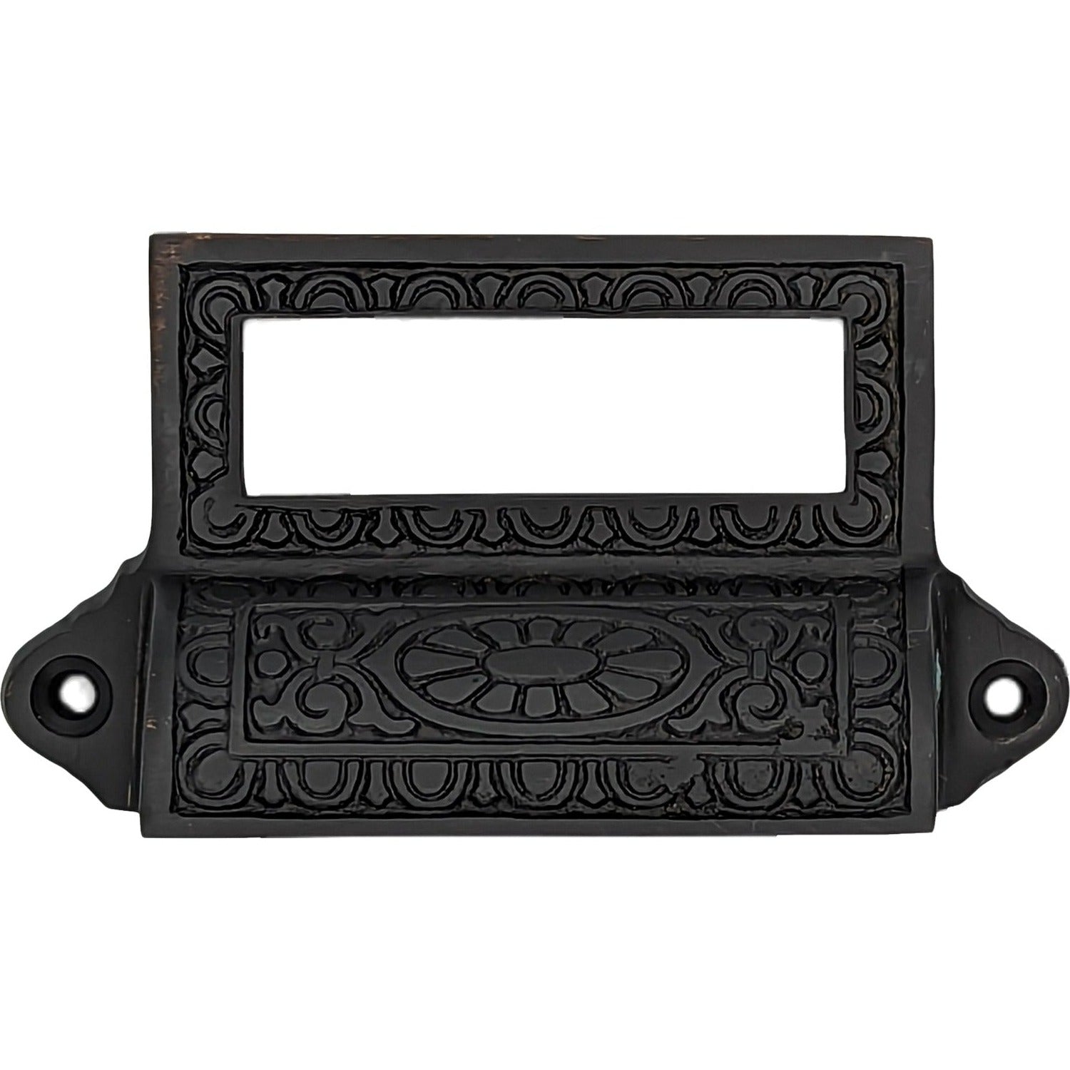 Measures 4 1/8 inches long and 2 1/4 inches tall. Has a place on top to put drawer labels. Center to center spacing measures 3 1/2 inches (88.9 mm 3.50 c-c). Hand cast and hand finished piece with highly ornate detailing.