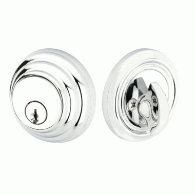 Low Profile Single Cylinder Deadbolt - shown in Polished Chrome. Solid brass cylinder and hardened steel bolt. Comes standard with a 2 3/8 inch or 2 3/4 inch back set, dead latch, face plate, strike plate and mounting hardware.