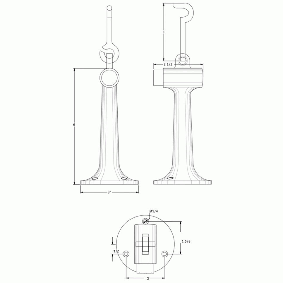 Floor Mounted Bumper With Hook & Eye - a solid brass universal modern floor mounted bumper (Antique Brass Finish) - this measures 6 inch tall and 3 inch in diameter. It also comes complete with the mounting screws. This style of door stop provides protection for the door by preventing it from banging against a wall causing damage to drywall or plaster and paint. This door stop is available in many designer finishes and comes complete with the mounting hardware.