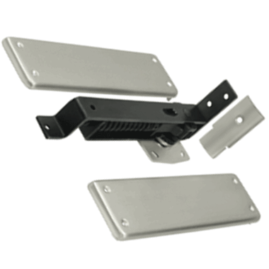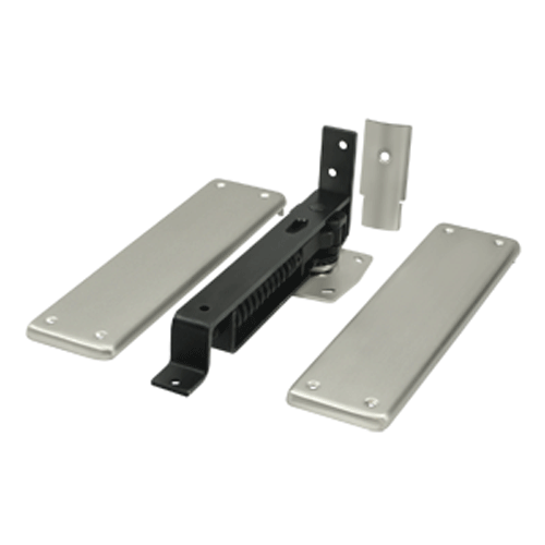 Double Action Solid Brass Spring Hinge (Brushed Nickel Finish) - Sold Individually - The double action spring hinge comes floor-mounted and features a self-closing hinge system with solid brass cover plates and trim. Comes complete with mounting hardware.