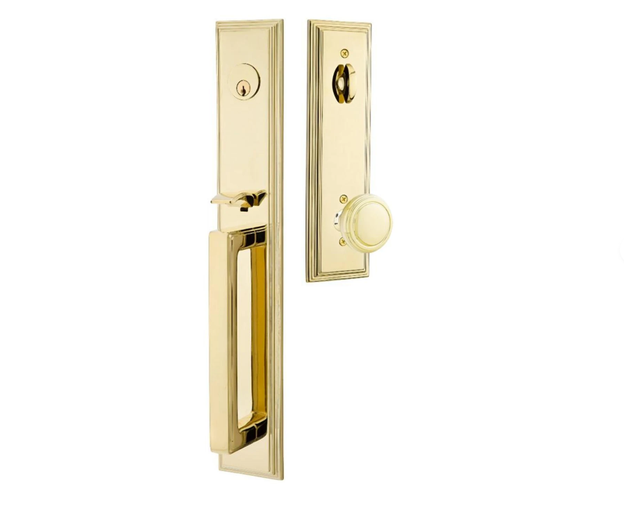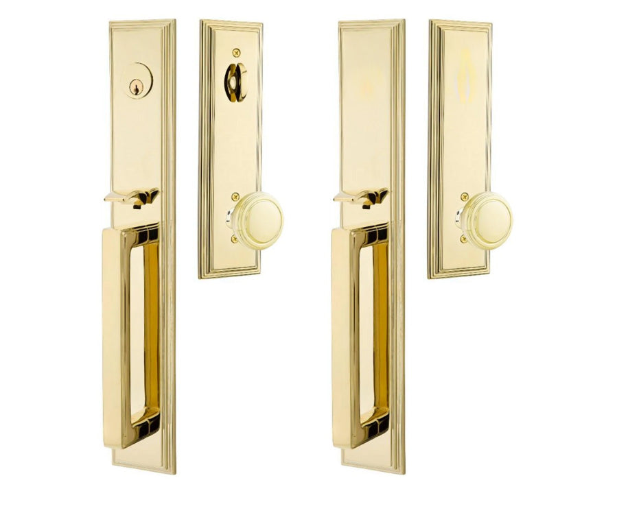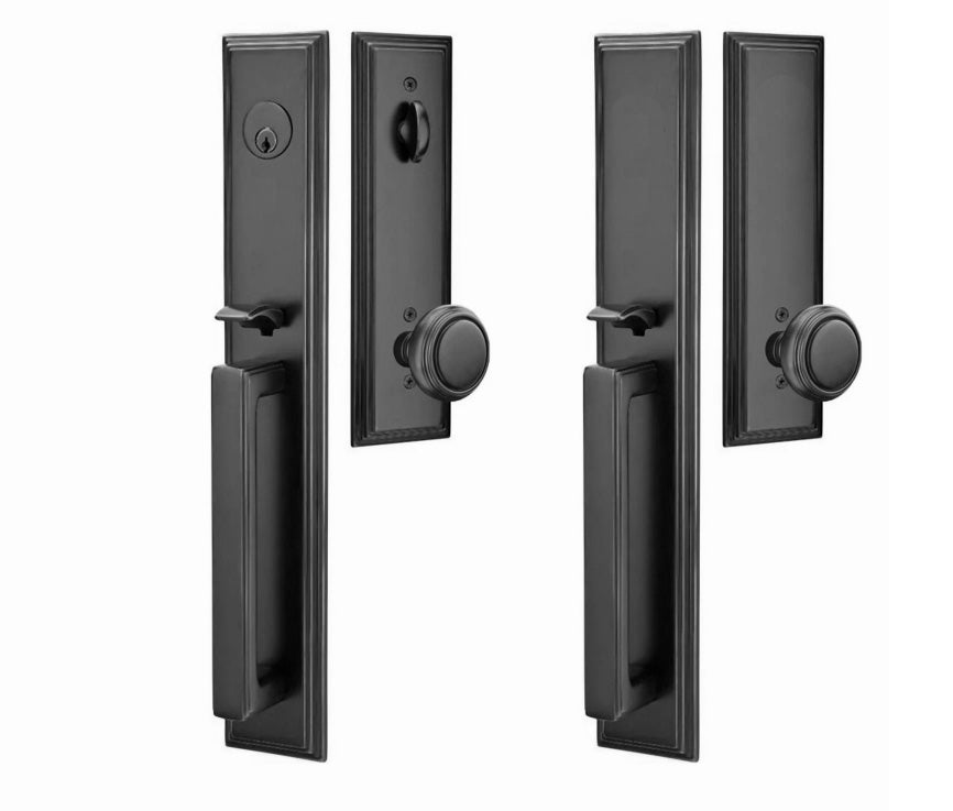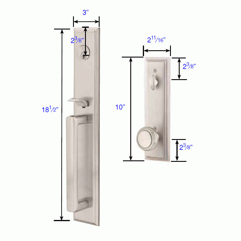 Solid Brass Melrose Style Entryway Set (Brushed Nickel Finish) - this entryway set measures 3 inch wide by 18 1/2 inch tall. Various styles of knobs available at no additional charge. Entryway set deadbolt to knob center-to-center distance is 5 1/2 inches. Entryway backset comes as 2 3/8 inch standard and a 2 3/4 inch backset is available if required. The overall grip thickness is 2 5/8 inch. The clearance between the door and grip is 1 3/8 inches. The plates have a thickness of 1/2 inch. This is a complete set and it comes with tubular latch mechanisms, strike plates, complete knob sets, internal mechanisms, deadbolts and all mounting hardware.