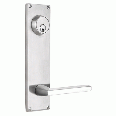 Stainless Steel Single Keyed Style Passage Entryway Set - The Emtek entryway set shown here includes a stylish stainless steel finish and is a single keyed style entryway. Measures 2 3/8 inches wide by 8 inches tall. Features the Helios style brass lever shown. Includes a center to center hole spacing of 5 1/2 inches and two standard 2 1/8 inch door preps. The standard latch is for 2 3/8 inch backsets. Please specify if a 2 3/4 inch backset is required. Sold as a complete set with lever, latch and strike plate.