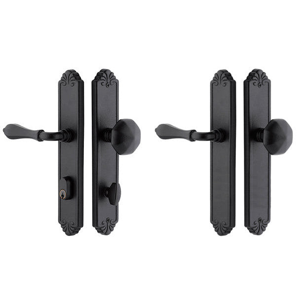 Tuscany Bronze Style Stretto Passage Entryway Set (Medium Bronze Finish Shown) - The Emtek Tuscany style locking door entryway features a prominent medium bronze finish. Measures 2 inches tall by 10 1/2 inches wide with a 3 3/8 inch center to center hole spacing. Includes narrow 1 1/4 inch door preps. Sold as a complete set, with knob, latch and strike plate. 28 degree latch is available in a 2 3/8 inch backset, must specify if a 2 3/4 inch backset is required. Several finishes available.