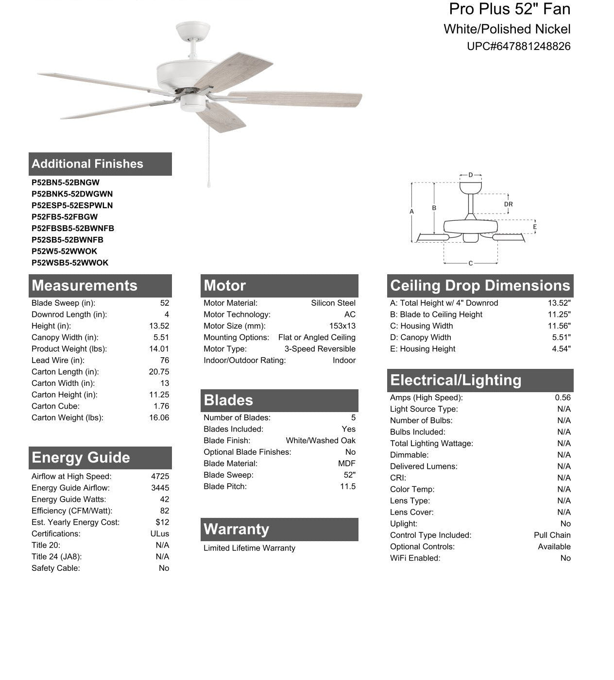 The ideal combination of excellent performance, exceptional value and timeless style, the Craftmade Pro Plus 52" ceiling fan featuring a clean motor, updated straight blade arms and canopy is built for performance. The dual mount, 3-speed, reversible fan includes custom 52" reversible blades. Optional light kits and remote controls are available(Sold Separately).