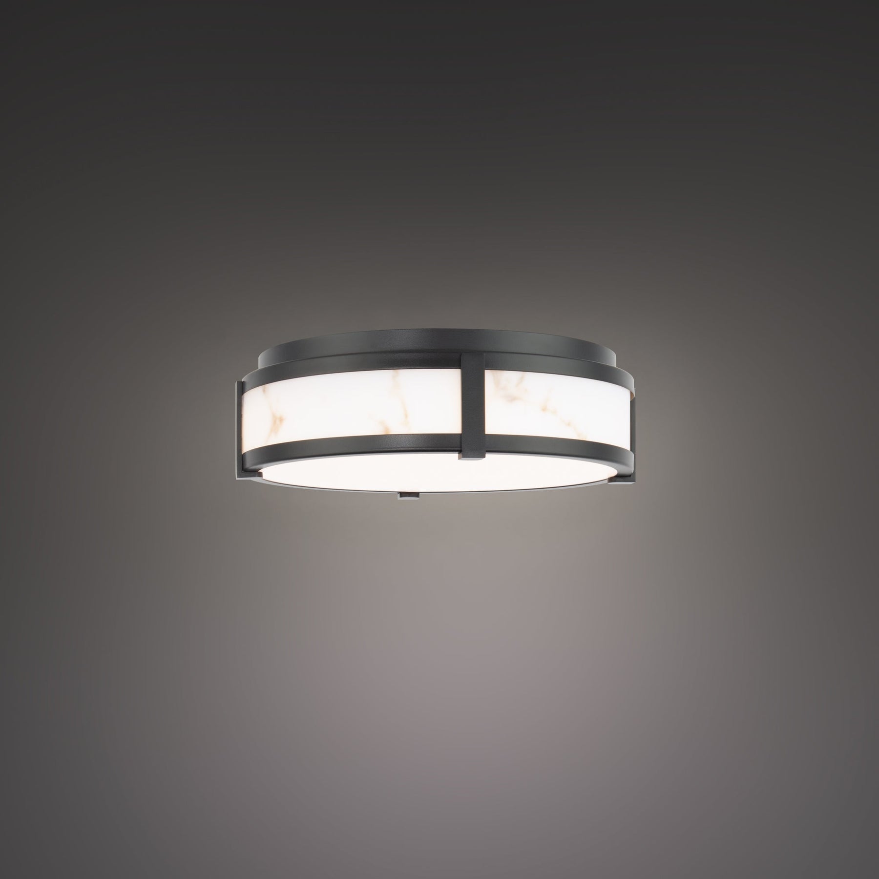 Constantine 14in LED Flush Mount 3000K in Black. Aged brass or black aluminum hardware with faux alabaster. Like real stone, the new Constantine dweLED indoor flush mount creates a stunning, warm and clean aesthetic as an eye-catching centerpiece. Each piece is unique and includes an etched acrylic diffuser for beautiful ambient illumination in a bath, living area or guest room. Available in an 18 inch and 14 inch diameter. Utilizes state of the art LEDs with a high 90 color rendering index and correlated color temperature of 3000 Kelvin. The canopy conceals a 120 volt LED driver. The LEDs have a long 50,000 hour rated life and deliver up to 1500 or more lumens. The LED luminaire is ETL and cETL listed for damp locations. It is California Title 24 rated and meets the highest energy efficient requirements. Dims beautifully using an electronic low voltage or TRIAC dimming system. Curvaceous with a stunning textured look. Constructed with a solid aluminum frame and an etched acrylic diffuser. Features a faux alabaster diffuser that creates a bright and even illumination. Constantine is damp location listed - can be used indoor or covered outdoor areas. It can be ceiling or wall mounted to suit any application. Available in a 14inch or 18 inch diameter. Includes a replaceable LED driver that is concealed within the frame. Smooth and continuous dimming with electronic low voltage ELV, or TRIAC dimmer options. High Powered Replaceable LED Module CRI: 90, Rated Hours: 50000, Color Temp: 3000K Standards: ETL & cETL UL 1598 listed with IP44 rating for Damp Locations. CEC Title 24 compliant.