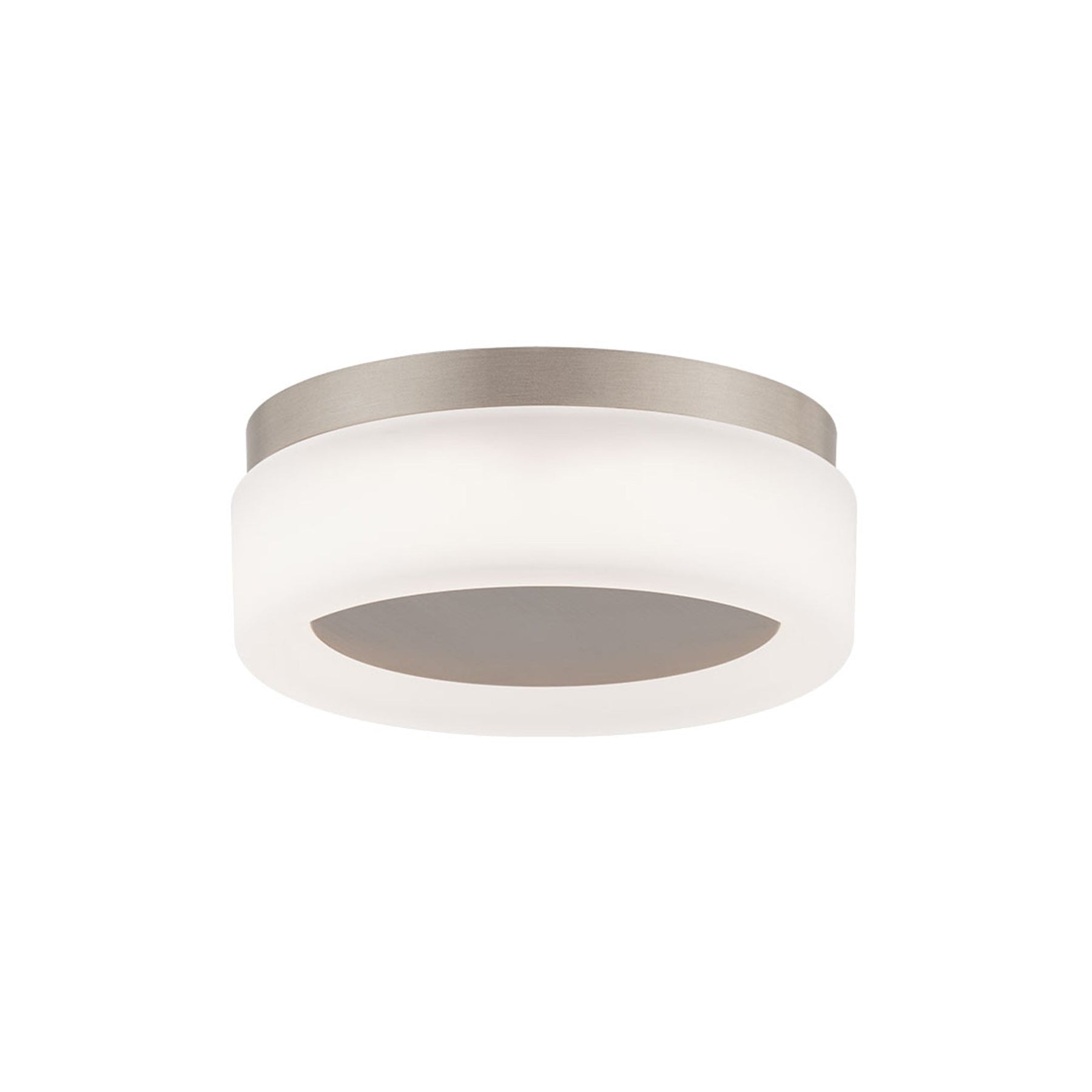 Bonham 8in LED Flush Mount 4000K in Brushed Nickel. Light rooms evenly with this classic flush mount luminaire. A thick-walled, etched shade delivers glare-free illumination from its simple round silhouette. Features an aluminum spun body with etched acrylic diffuser Bonham is damp location listed - it can be used indoor or covered outdoor areas. This fixture can be mounted on a wall or ceiling to suit any application. AC LED technology - no driver or transformer required. Easily fits on a pancake junction box. Built in color temperature adjustability. Switch from 2700K/3000K/3500K/4000K Smooth and continuous dimming with an electronic low voltage (ELV) or TRIAC dimmer. High Powered Replaceable LED Module CRI: 90, Rated Hours: 54000, Selectable Color Temp: 2700K-3000K-3500K-4000K Standards: ETL & cETL UL 1598 listed for Damp Locations. CEC Title 24 Compliant, and ADA Compliant.