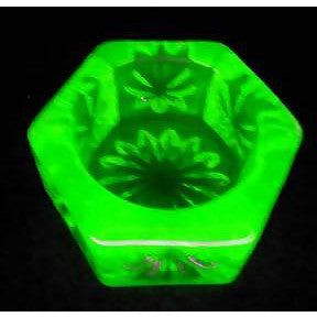 This salt cellar is made from Vaseline Glass and the pattern is called Hexagonal. Vaseline glass has trace amounts of Uranium Oxide which allows the glass to glow when near a black light. This elegant salt cellar measures 1 1/2 inches in diameter. In normal light, the glass appears as a yellowish green color.