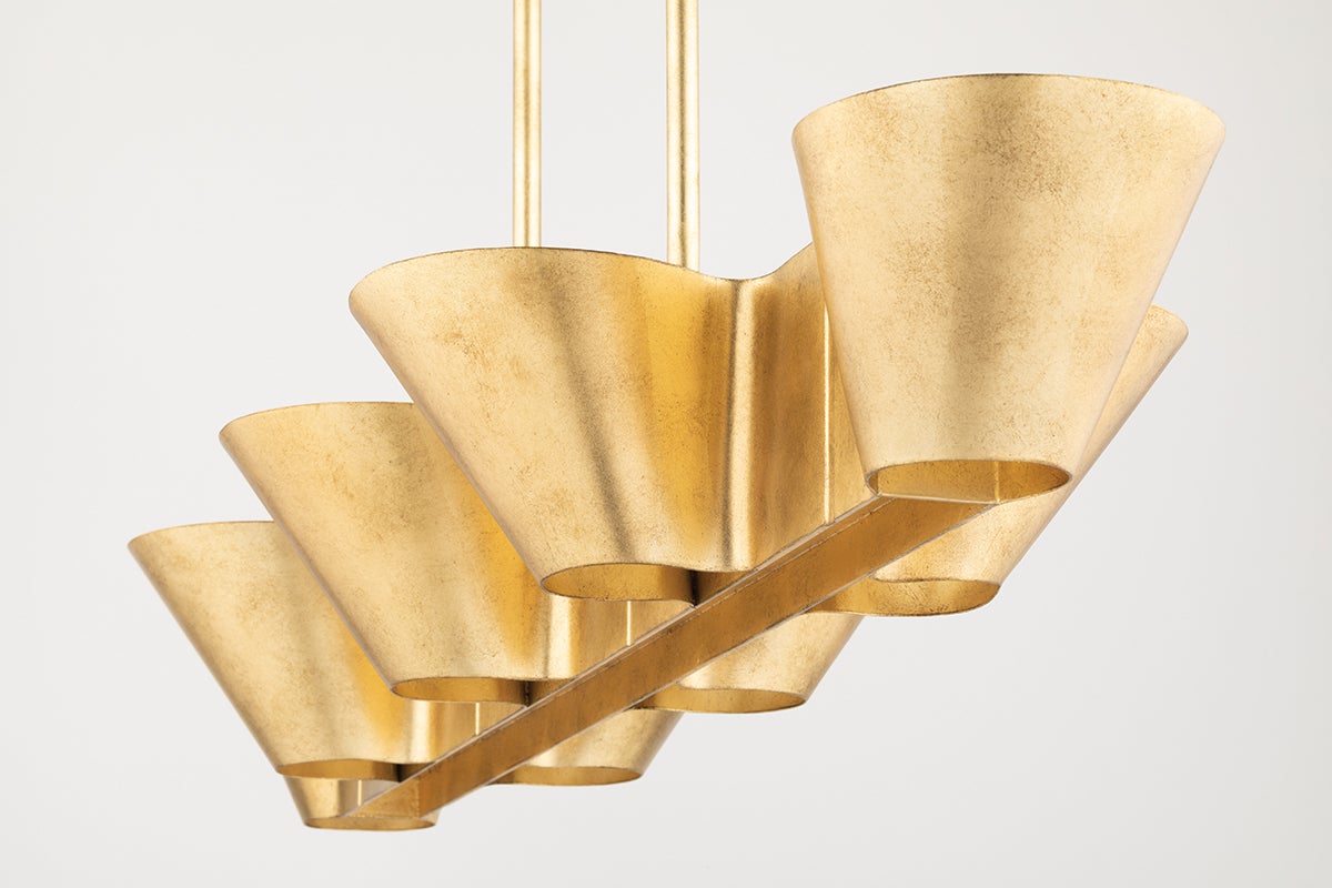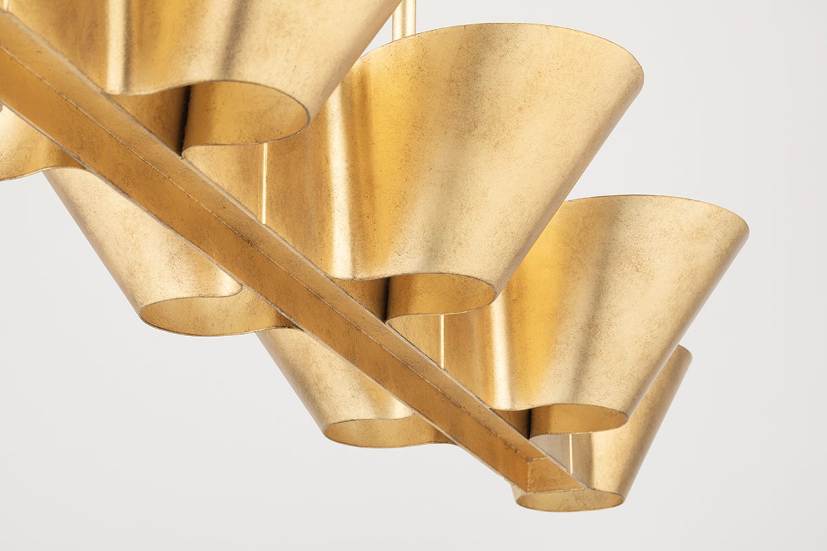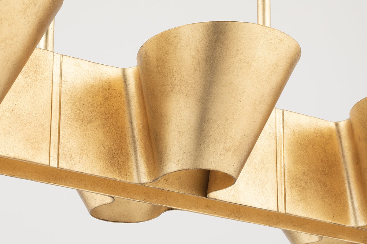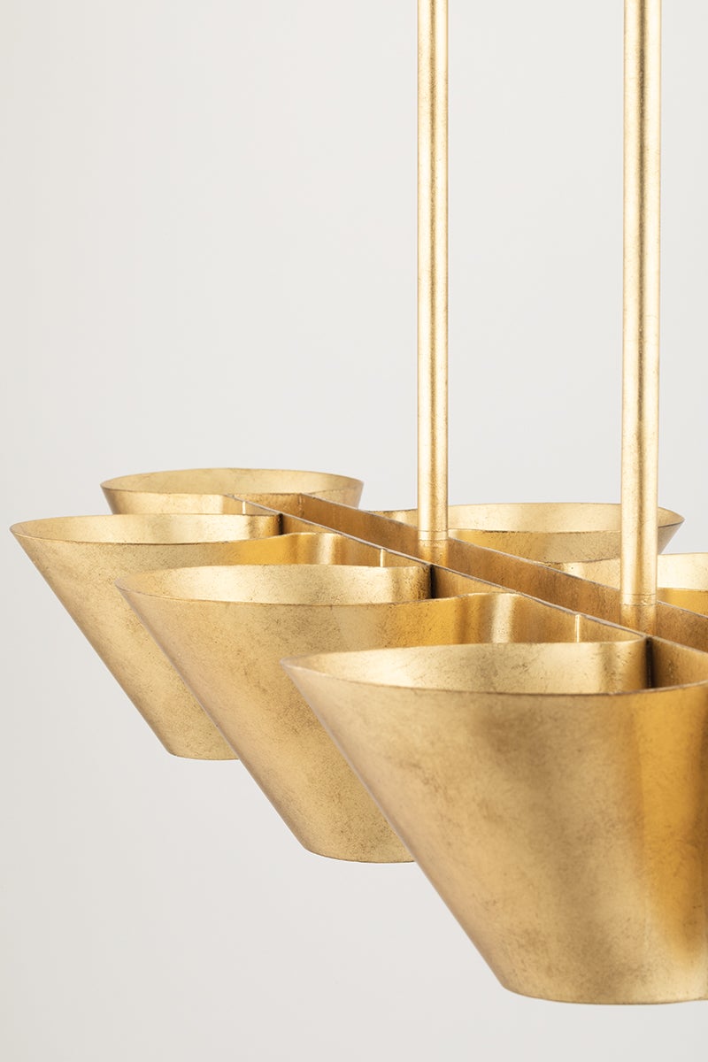 The Reeve chandelier by Hudson Valley Lighting in Vintage Gold Leaf (VGL) offers an elegant lighting solution for your space. Featuring eight E26 medium base sockets, it accommodates a maximum wattage of 40W per bulb (bulbs not included). With a diameter of 15.50 inches and a height of 9.00 inches, this chandelier effortlessly blends style and functionality. Its length of 52.00 inches makes it ideal for dining areas or living rooms. This fixture is designed for damp environments, ensuring versatility in various settings.