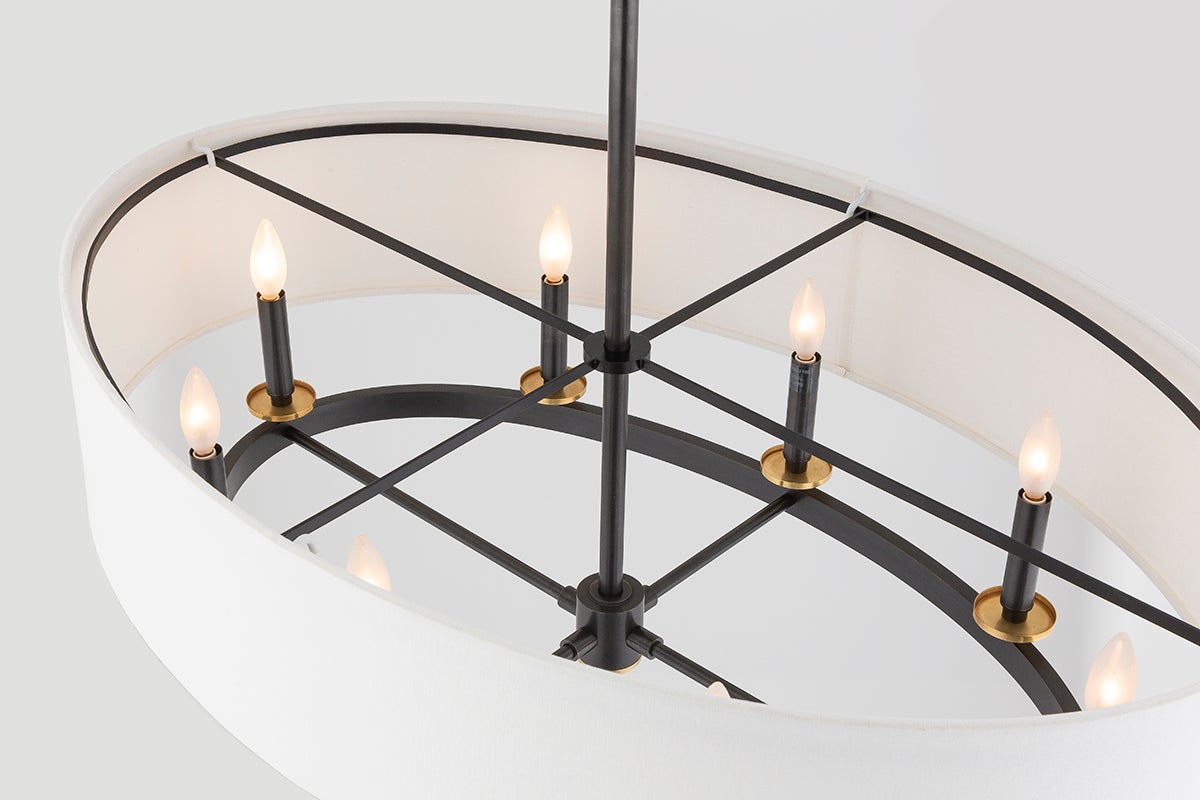 The Durham Ceiling Fixture by Hudson Valley Lighting combines style and versatility with its elegant off-white linen shade and robust aging options, including Aged Brass, Aged Old Bronze, and Polished Nickel finishes. Measuring 39.25 inches in width, 11.75 inches in height, and 20.25 inches in length, this striking design features eight E12 candelabra base sockets, accommodating a recommended bulb type of B11 with a maximum wattage of 40W. Its UL Damp rating makes it a perfect lighting choice for areas exposed to moisture, while its refined aesthetics suit various interior styles.