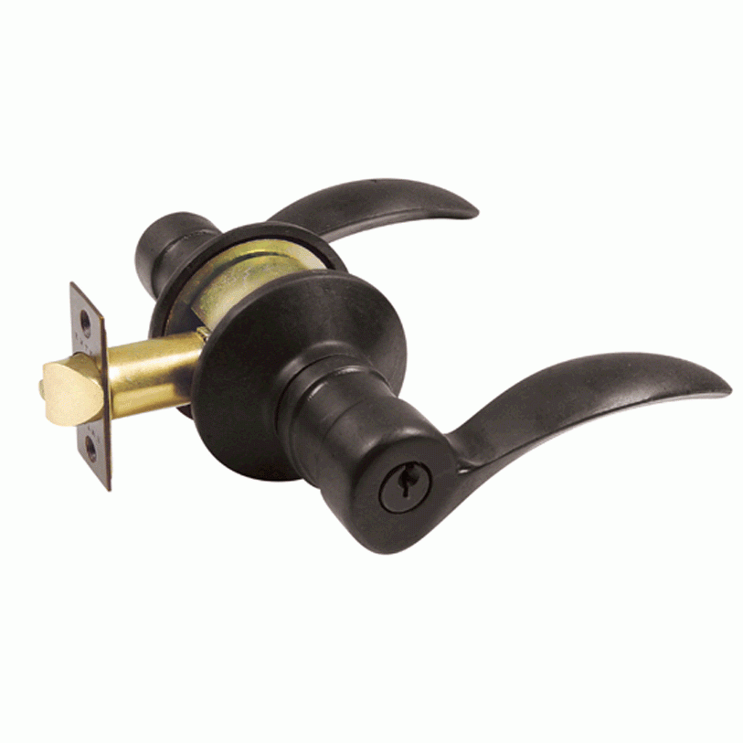 The key in door lever set pictured here includes a strong solid brass construction and an outstanding matte black finish. The Durango style lever measures 5 inches wide with a 2 3/4 inch projection. The #2 rosette measures 2 3/4 inches wide. Includes adjustable latch (2 3/8 inches and 2 3/4 inches backsets), strikeplate, two levers and two door rosettes. This set is made for modern doors and it fits any door thickness between 1 1/4 inch to 1 7/8 inches thick. Key-In knobs are larger than double dummy and non-locking knobs to accommodate the lock. Available in a variety of other finishes. The average lead time for this lever is approximately 3 to 5 business days.