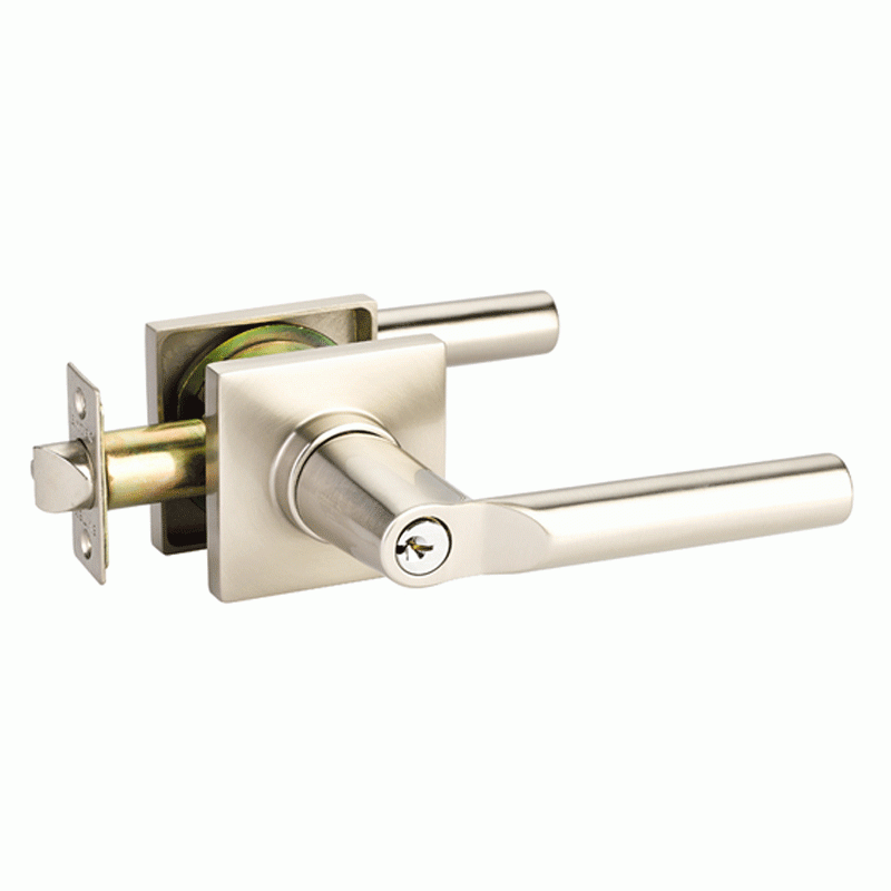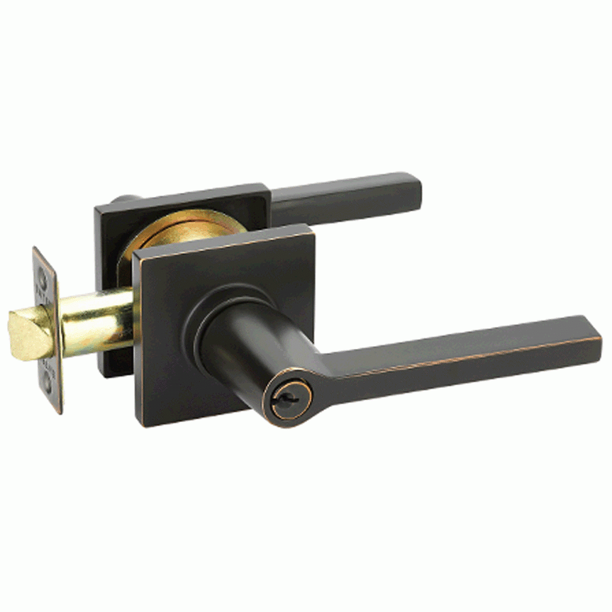 The key in door lever shown here features a solid brass construction and is available in either oil rubbed bronze or brushed nickel. The lever measures 4 3/4 inches wide with a 2 inch projection. The square rosette measures 2 1/4 inches in length by 2 1/4 inches wide. Includes adjustable latch (2 3/8 inches and 2 3/4 inches backsets), strikeplate, two levers and two door rosettes. This set is made for modern doors and it fits any door thickness between 1 1/4 inch to 1 7/8 inches thick. Key-In knobs are larger than double dummy and non-locking knobs to accommodate the lock. The average lead time for this lever is approximately 3 to 5 business days.