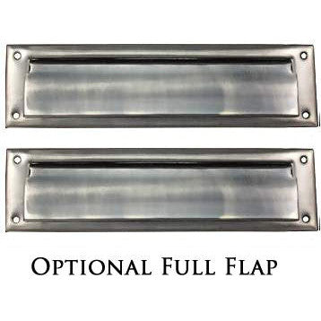 Magazine Size Front Door Mail Slot (Antique Nickel) - measures 3 5/8 inches by 13 inches and this is made for door openings of 2 3/8 inches by 11 inches. Exterior flap is spring-loaded and this comes with a back finish plate. Optional full back flap available. For use on both wood and metal doors.