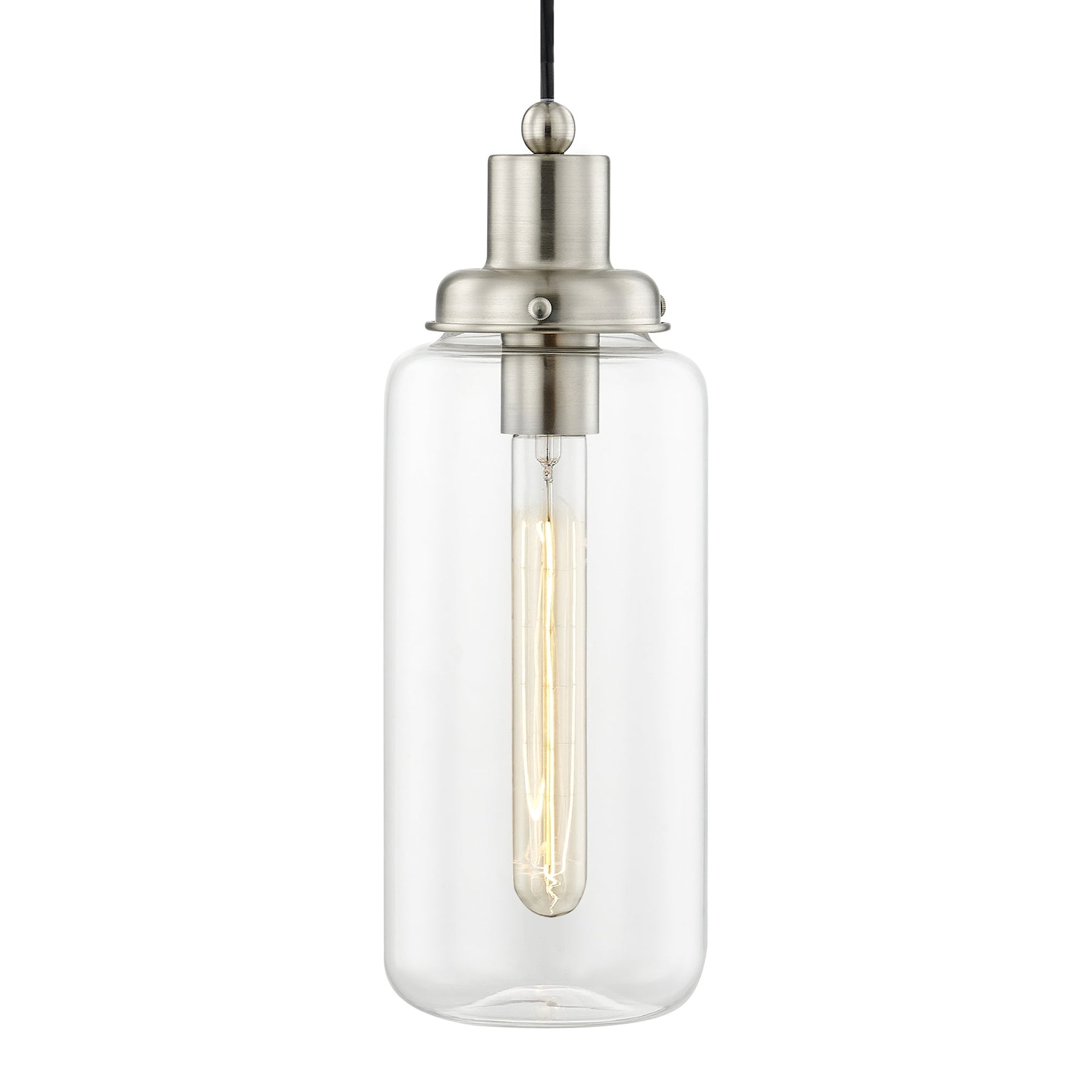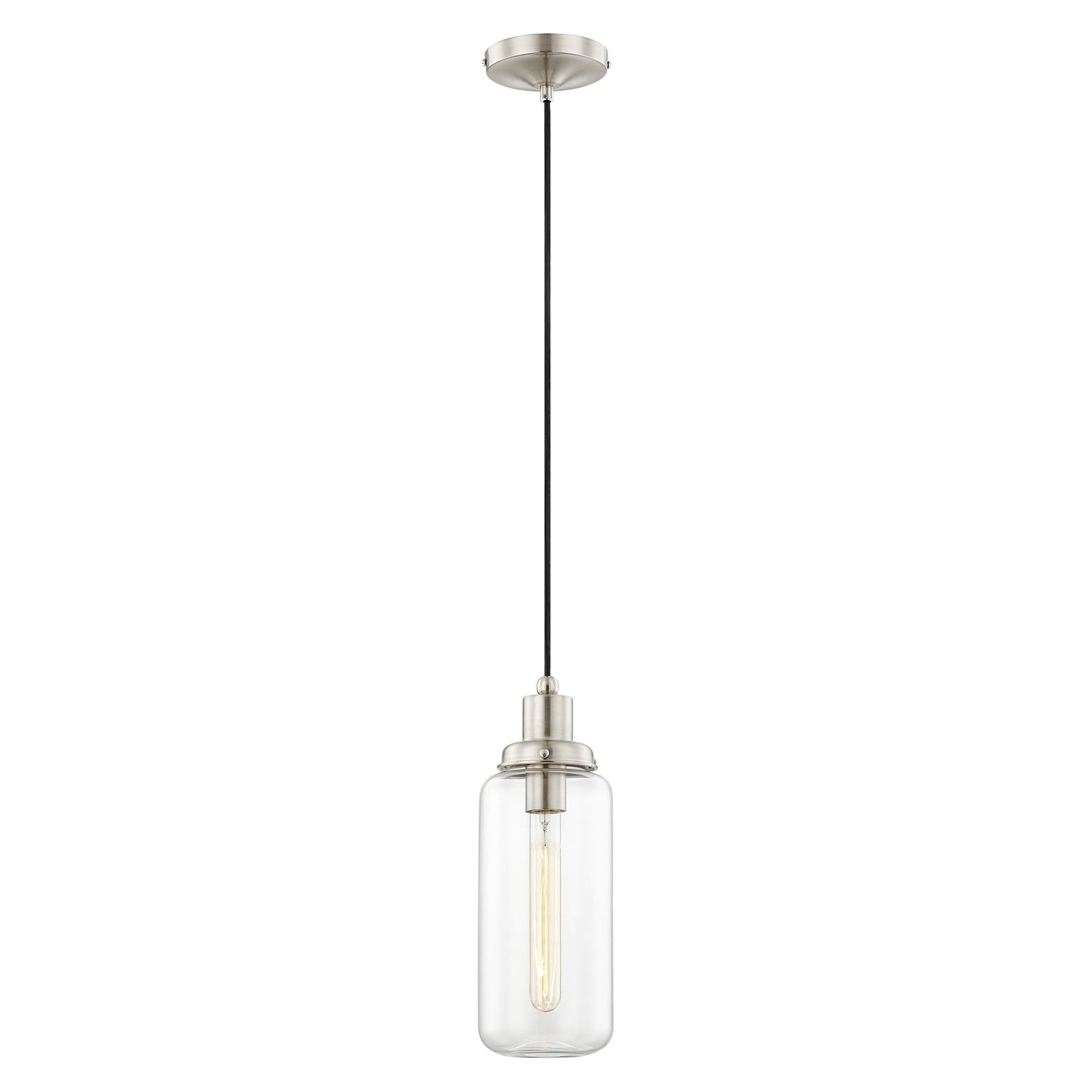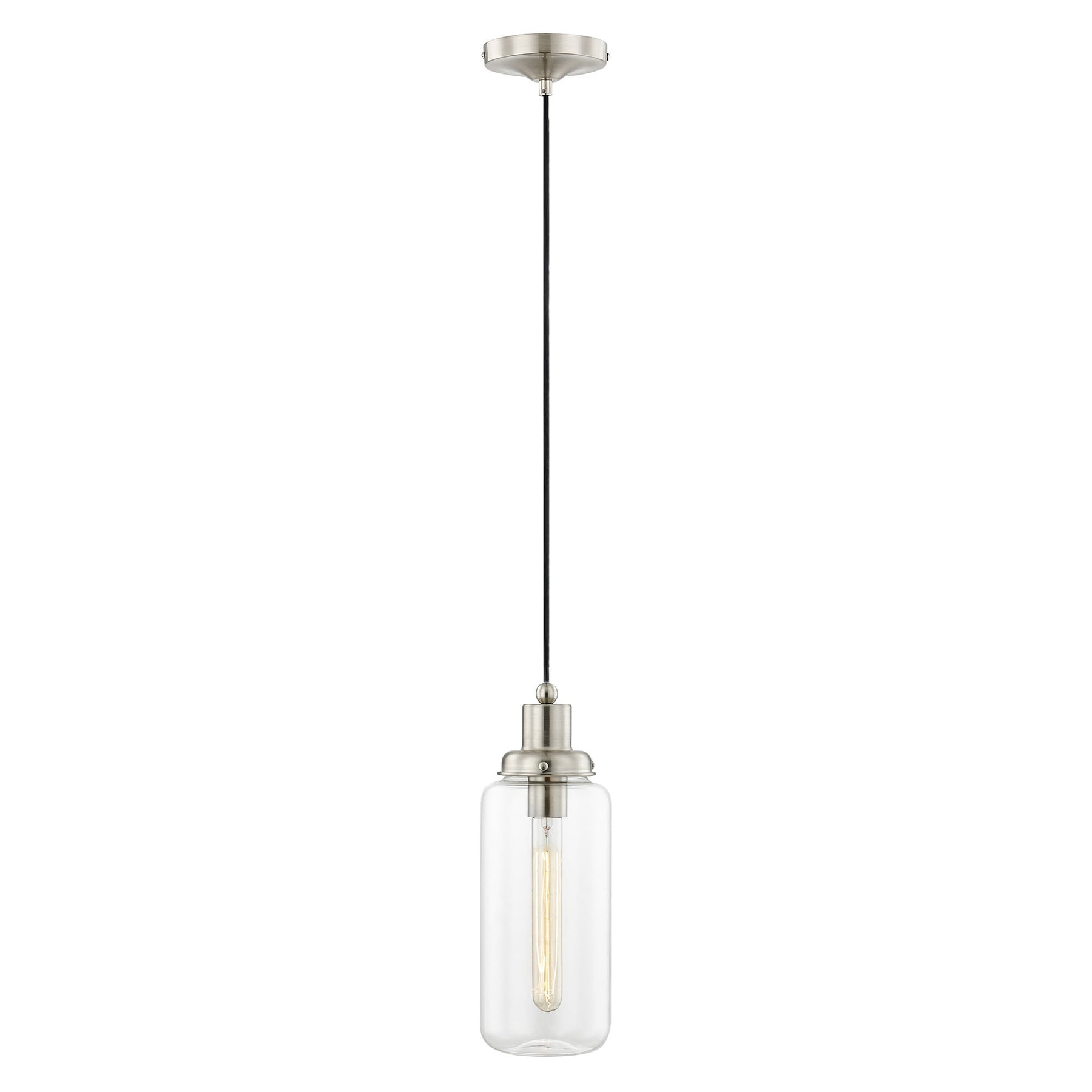 The 40614-91 Art Glass Mini Pendant in Brushed Nickel is a striking addition for anyone looking to enhance their space with industrial charm. This pendant light features a clear hand-blown glass shade and requires one medium base bulb with a maximum wattage of 75W (not included). With an adjustable height ranging from 19.5 inches to 80 inches and a 5-inch diameter, it fits seamlessly in various settings. Additionally, it is suitable for damp locations, making it ideal for kitchens and covered patios, while its design accommodates sloped ceilings.