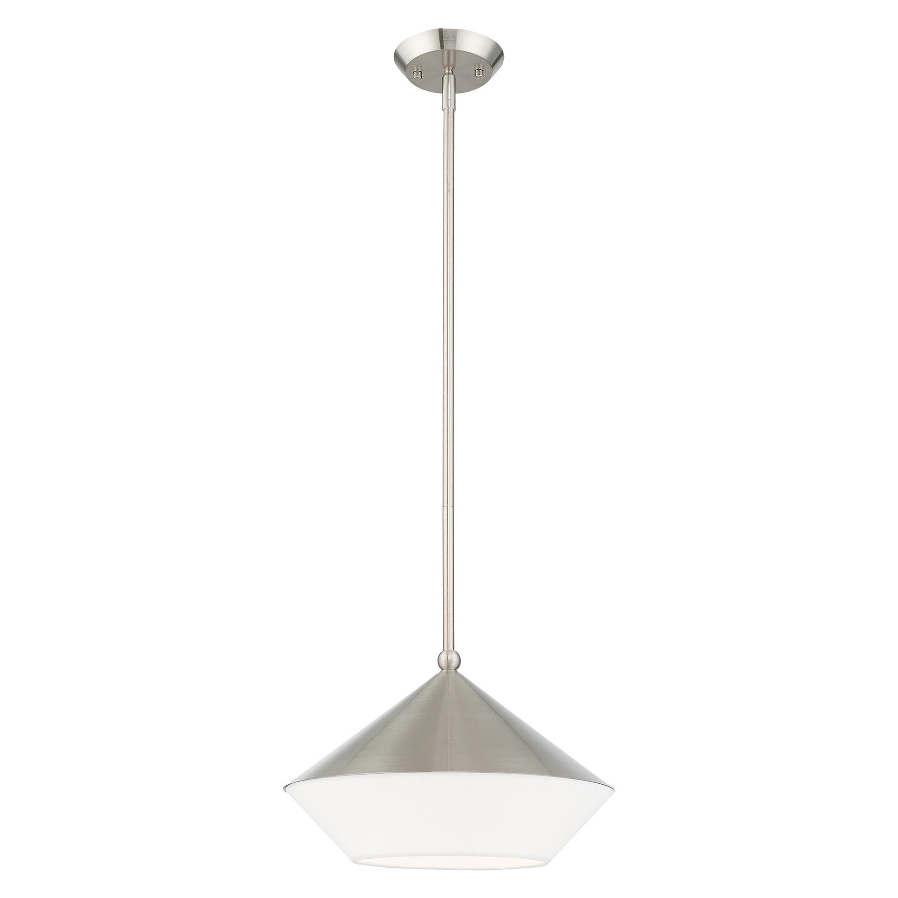 The Stockholm Mini Pendant, item number 40685-91, is a striking addition to any space, featuring a height that can be adjusted from 17 inches to 47 inches and a diameter of 13 inches. Created with a durable brushed nickel finish and a handcrafted off-white hardback shade, this pendant embodies a captivating mid-century modern aesthetic. It requires one medium base bulb (not included) with a maximum wattage of 40W and is designed to accommodate sloped ceilings. Ideal for damp locations, this fixture also includes three stem sections (6\
