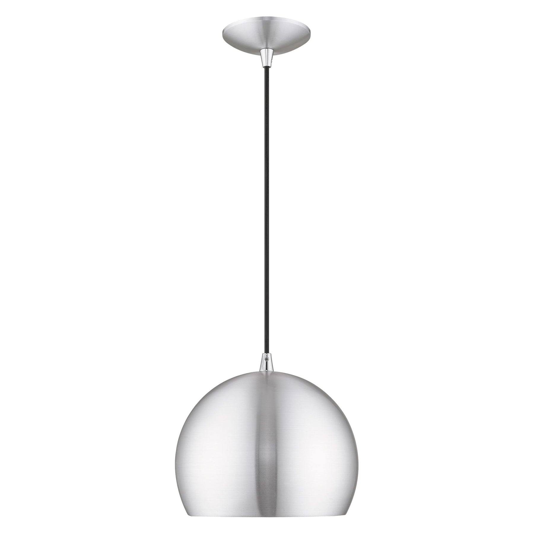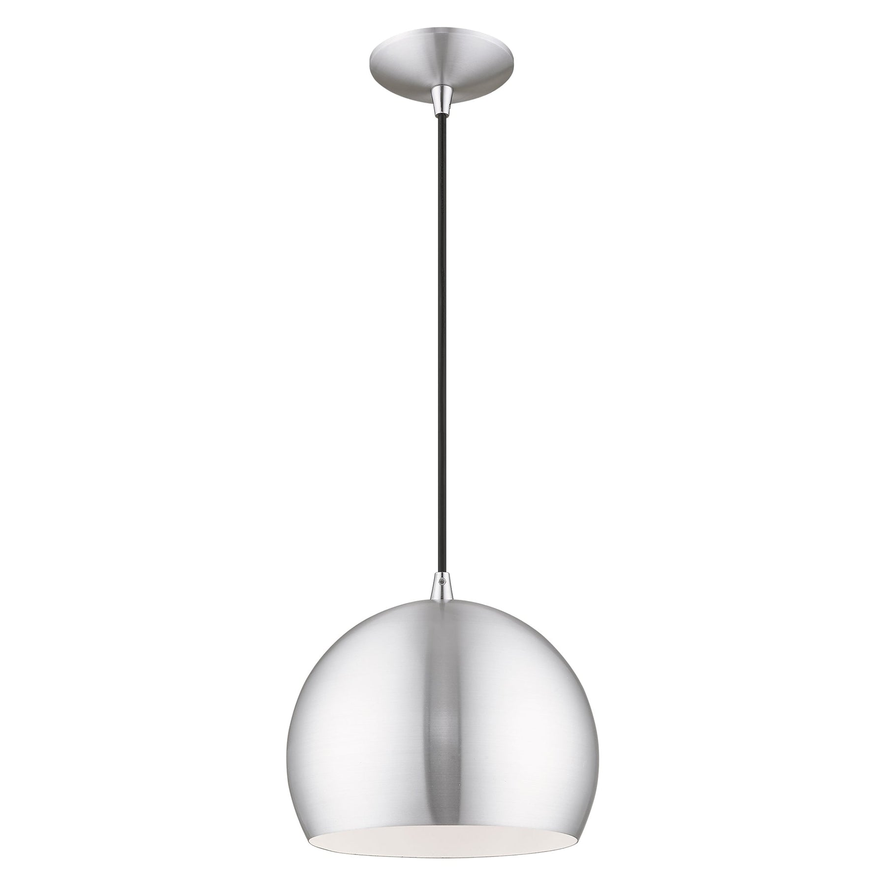 The 41181-66 Metal Shade Mini Pendant is a stunning addition for those looking to elevate their space with a modern touch. Measuring 14 to 75 inches in height and featuring a 10-inch diameter, this pendant is perfect for hanging above kitchen counters or dining areas. It requires a single medium base bulb with a maximum wattage of 60W (not included). The brushed aluminum exterior coupled with a shiny white finish inside the shade gives it a sleek and contemporary aesthetic. Designed for damp locations and accommodating sloped ceilings, this pendant combines style and functionality seamlessly.