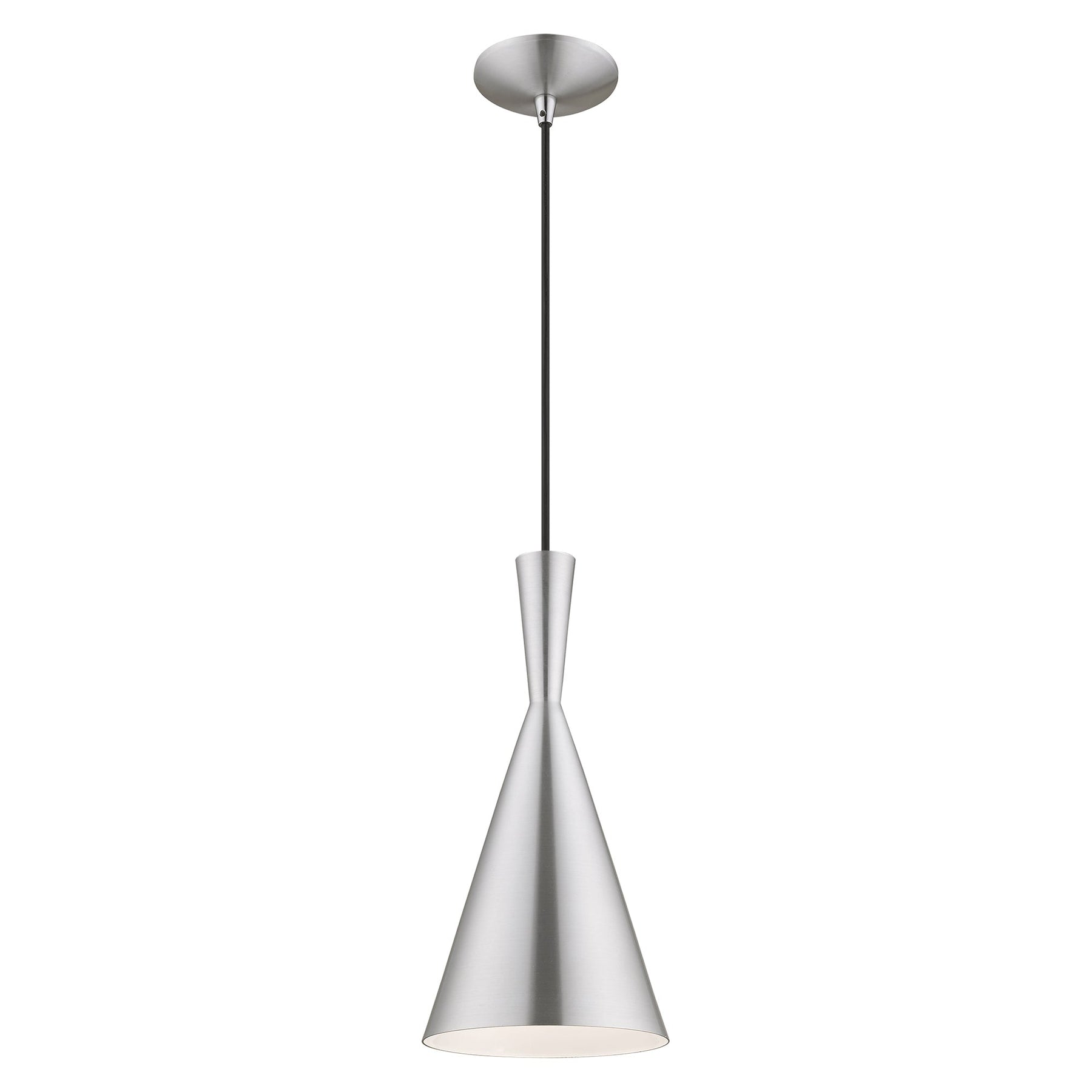 The 41185-66 Metal Shade Mini Pendant is a striking addition to your mid-century modern decor. This pendant light features a brushed aluminum finish with a shiny white interior, creating a stylish contrast. It measures 21 inches in height, adjustable up to 80 inches, and has a diameter of 7.25 inches. This fixture requires one medium base bulb (not included), with a maximum wattage of 60W. With a 6-foot wire and the ability to accommodate sloped ceilings, it is suitable for damp locations, making it a versatile choice for various settings.